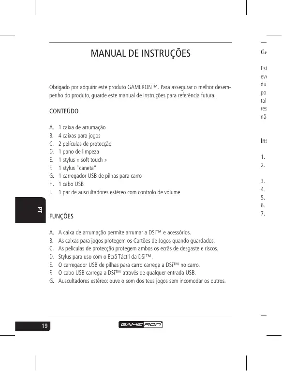 Garantia Obrigado por adquirir este produto GAMERON™. Para assegurar o melhor desempenho do produto, guarde este manual de instruções para referência futura. Este produ evento de durante e por um m talão de c resultante não tenha CONTEÚDO
