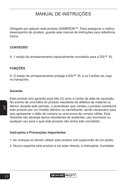 Obrigado por adquirir este produto GAMERON™. Para assegurar o melhor desempenho do produto, guarde este manual de instruções para referência futura. CONTEÚDO A. 1 estojo de armazenamento especialmente concebido para a DSi™ XL FUNÇÕES A. O estojo de armazenamento protege a DSi™ XL e os Cartões de Jogo no transporte. Garantia