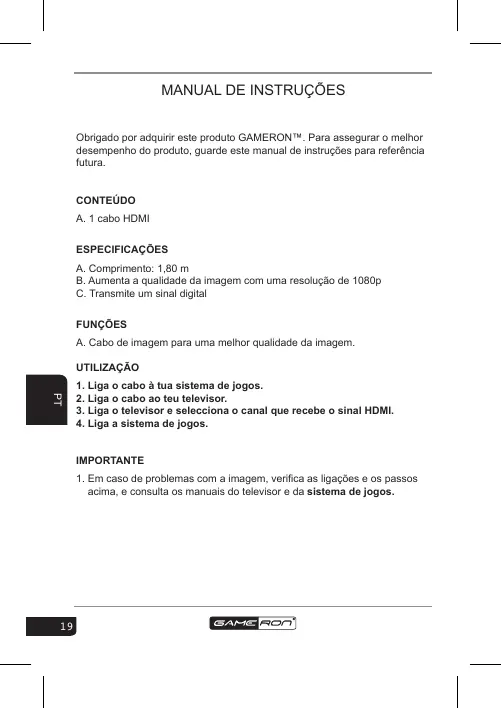 Obrigado por adquirir este produto GAMERON™. Para assegurar o melhor desempenho do produto, guarde este manual de instruções para referência futura. CONTEÚDO A. 1 cabo HDMI ESPECIFICAÇÕES A. Comprimento: 1,80 m B. Aumenta a qualidade da imagem com uma resolução de 1080p C. Transmite um sinal digital FUNÇÕES A. Cabo de imagem para uma melhor qualidade da imagem. UTILIZAÇÃO