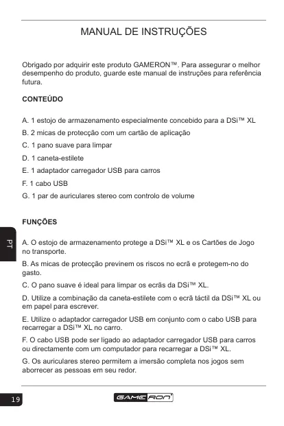 Obrigado por adquirir este produto GAMERON™. Para assegurar o melhor desempenho do produto, guarde este manual de instruções para referência futura. CONTEÚDO A. 1 estojo de armazenamento especialmente concebido para a DSi™ XL B. 2 micas de protecção com um cartão de aplicação C. 1 pano suave para limpar D. 1 caneta-estilete E. 1 adaptador carregador USB para carros F. 1 cabo USB G. 1 par de auriculares stereo com controlo de volume FUNÇÕES