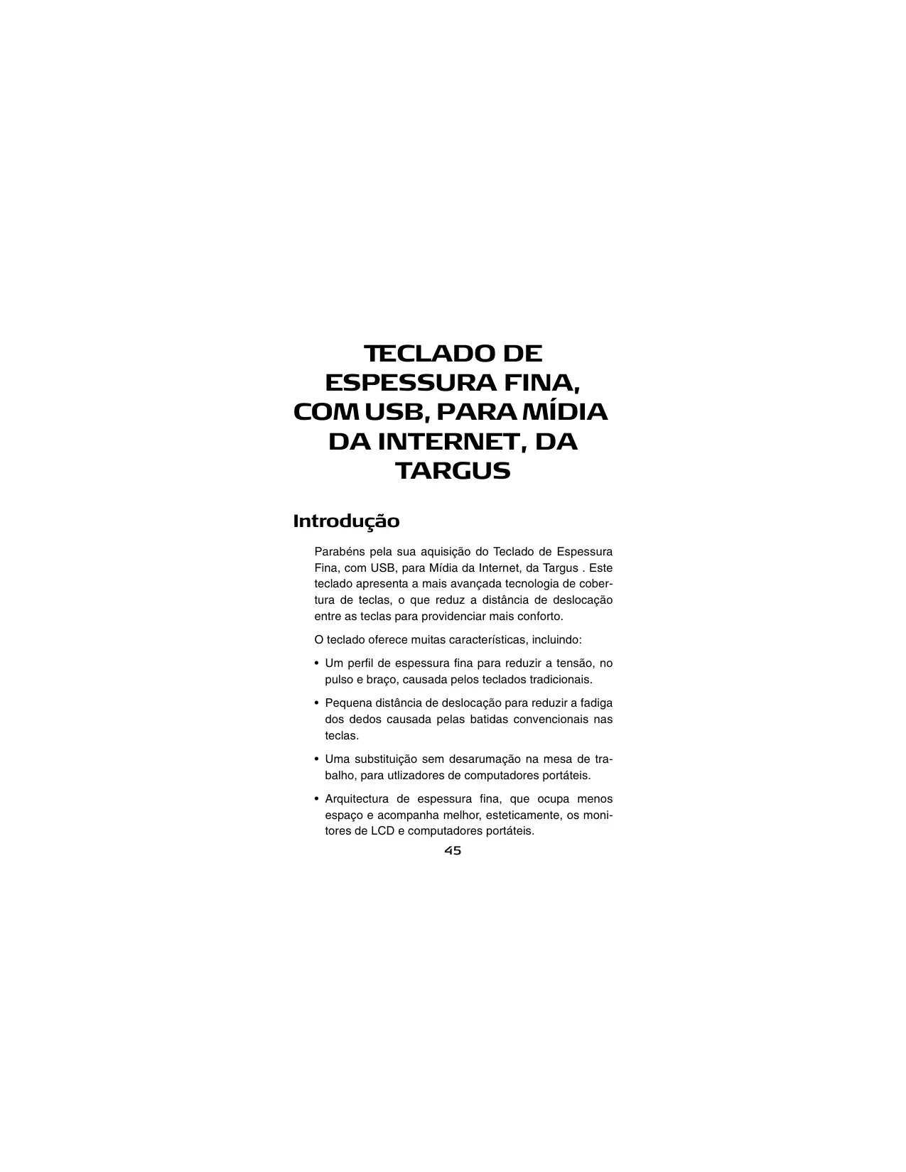 Félicitations pour l'achat de ce clavier USB plat Targus, avec fonctions média et Internet. Ce clavier intègre les technologies les plus novatrices en matière d'ergonomie : réduction de l'espace entre les touches pour un meilleur confort.