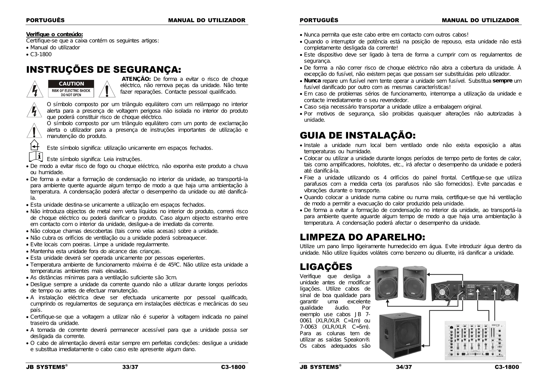Verifique o conteúdo: Certifique-se que a caixa contém os seguintes artigos: Manual do utilizador C3-1800 INSTRUÇÕES DE SEGURANÇA: CAUTION ATENÇÃO: De forma a evitar o risco de choque eléctrico, não remova peças da unidade. Não tente fazer reparações. Contacte pessoal qualificado. O símbolo composto por um triângulo equilátero com um relâmpago no interior alerta para a presença de voltagem perigosa não isolada no interior do produto que poderá constituir risco de choque eléctrico. O símbolo composto por um triângulo equilátero com um ponto de exclamação alerta o utilizador para a presença de instruções importantes de utilização e manutenção do produto. Este símbolo significa: utilização unicamente em espaços fechados. Este símbolo significa: Leia instruções. De modo a evitar risco de fogo ou choque eléctrico, não exponha este produto a chuva ou humidade. De forma a evitar a formação de condensação no interior da unidade, ao transportá-la para ambiente quente aguarde algum tempo de modo a que haja uma ambientação à temperatura. A condensação poderá afectar o desempenho da unidade ou até danificála. Esta unidade destina-se unicamente a utilização em espaços fechados. Não introduza objectos de metal nem verta líquidos no interior do produto, correrá risco de choque eléctrico ou poderá danificar o produto. Caso algum objecto estranho entre em contacto com o interior da unidade, desligue-a de imediato da corrente. Não coloque chamas descobertas (tais como velas acesas) sobre a unidade. Não cubra os orifícios de ventilação ou a unidade poderá sobreaquecer. Evite locais com poeiras. Limpe a unidade regularmente. Mantenha esta unidade fora do alcance das crianças. Esta unidade deverá ser operada unicamente por pessoas experientes. Temperatura ambiente de funcionamento máxima é de 45ºC. Não utilize esta unidade a temperaturas ambientes mais elevadas. As distâncias mínimas para a ventilação suficiente são 3cm. Desligue sempre a unidade da corrente quando não a utilizar durante longos períodos de tempo ou antes de efectuar manutenção. A instalação eléctrica deve ser efectuada unicamente por pessoal qualificado, cumprindo os regulamentos de segurança em instalações eléctricas e mecânicas do seu país. Certifique-se que a voltagem a utilizar não é superior à voltagem indicada no painel traseiro da unidade. A tomada de corrente deverá permanecer acessível para que a unidade possa ser desligada da corrente. O cabo de alimentação deverá estar sempre em perfeitas condições: desligue a unidade e substitua imediatamente o cabo caso este apresente algum dano. JB SYSTEMS® 33/37 C3-1800 PORTUGUÊS