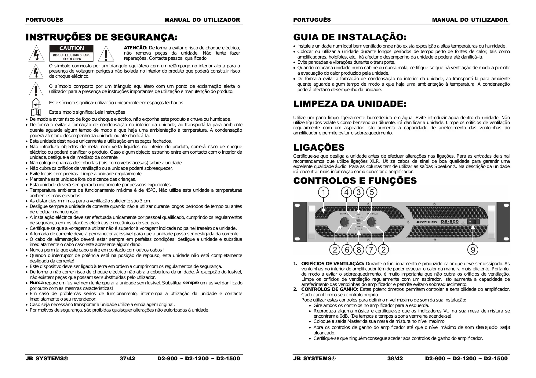 GUIA DE INSTALAÇÃO: Instale a unidade num local bem ventilado onde não exista exposição a altas temperaturas ou humidade. Colocar ou utilizar a unidade durante longos períodos de tempo perto de fontes de calor, tais como amplificadores, holofotes, etc., irá afectar o desempenho da unidade e poderá até danificá-la. Evite pancadas e vibrações durante o transporte. Quando colocar a unidade numa cabine ou numa mala, certifique-se que há ventilação de modo a permitir a evacuação do calor produzido pela unidade. De forma a evitar a formação de condensação no interior da unidade, ao transportá-la para ambiente quente aguarde algum tempo de modo a que haja uma ambientação à temperatura. A condensação poderá afectar o desempenho da unidade. LIMPEZA DA UNIDADE: Este símbolo significa: Leia instruções De modo a evitar risco de fogo ou choque eléctrico, não exponha este produto a chuva ou humidade. De forma a evitar a formação de condensação no interior da unidade, ao transportá-la para ambiente quente aguarde algum tempo de modo a que haja uma ambientação à temperatura. A condensação poderá afectar o desempenho da unidade ou até danificá-la. Esta unidade destina-se unicamente a utilização em espaços fechados. Não introduza objectos de metal nem verta líquidos no interior do produto, correrá risco de choque eléctrico ou poderá danificar o produto. Caso algum objecto estranho entre em contacto com o interior da unidade, desligue-a de imediato da corrente. Não coloque chamas descobertas (tais como velas acesas) sobre a unidade. Não cubra os orifícios de ventilação ou a unidade poderá sobreaquecer. Evite locais com poeiras. Limpe a unidade regularmente. Mantenha esta unidade fora do alcance das crianças. Esta unidade deverá ser operada unicamente por pessoas experientes. Temperatura ambiente de funcionamento máxima é de 45ºC. Não utilize esta unidade a temperaturas ambientes mais elevadas. As distâncias mínimas para a ventilação suficiente são 3 cm. Desligue sempre a unidade da corrente quando não a utilizar durante longos períodos de tempo ou antes de efectuar manutenção. A instalação eléctrica deve ser efectuada unicamente por pessoal qualificado, cumprindo os regulamentos de segurança em instalações eléctricas e mecânicas do seu país. Certifique-se que a voltagem a utilizar não é superior à voltagem indicada no painel traseiro da unidade. A tomada de corrente deverá permanecer acessível para que a unidade possa ser desligada da corrente. O cabo de alimentação deverá estar sempre em perfeitas condições: desligue a unidade e substitua imediatamente o cabo caso este apresente algum dano. Nunca permita que este cabo entre em contacto com outros cabos! Quando o interruptor de potência está na posição de repouso, esta unidade não está completamente desligada da corrente! Este dispositivo deve ser ligado à terra em ordem a cumprir com os regulamentos de segurança. De forma a não correr risco de choque eléctrico não abra a cobertura da unidade. À excepção do fusível, não existem peças que possam ser substituídas pelo utilizador. Nunca repare um fusível nem tente operar a unidade sem fusível. Substitua sempre um fusível danificado por outro com as mesmas características! Em caso de problemas sérios de funcionamento, interrompa a utilização da unidade e contacte imediatamente o seu revendedor. Caso seja necessário transportar a unidade utilize a embalagem original. Por motivos de segurança, são proibidas quaisquer alterações não autorizadas à unidade. Utilize um pano limpo ligeiramente humedecido em água. Evite introduzir água dentro da unidade. Não utilize líquidos voláteis como benzeno ou diluente, irá danificar a unidade. Limpe os orifícios de ventilação regularmente com um aspirador. Isto aumenta a capacidade de arrefecimento das ventoinhas do amplificador e permite evitar o sobreaquecimento. JB SYSTEMS® JB SYSTEMS® 37/42 D2-900 ~ D2-1200 ~ D2-1500 LIGAÇÕES Certifique-se que desliga a unidade antes de efectuar alterações nas ligações. Para as entradas de sinal recomendamos que utilize ligações XLR. Utilize cabos de sinal de boa qualidade para garantir uma excelente qualidade áudio. Para as colunas tem de utilizar as saídas Speakon®. Na descrição da unidade irá encontrar mais informação como conectar o amplificador.