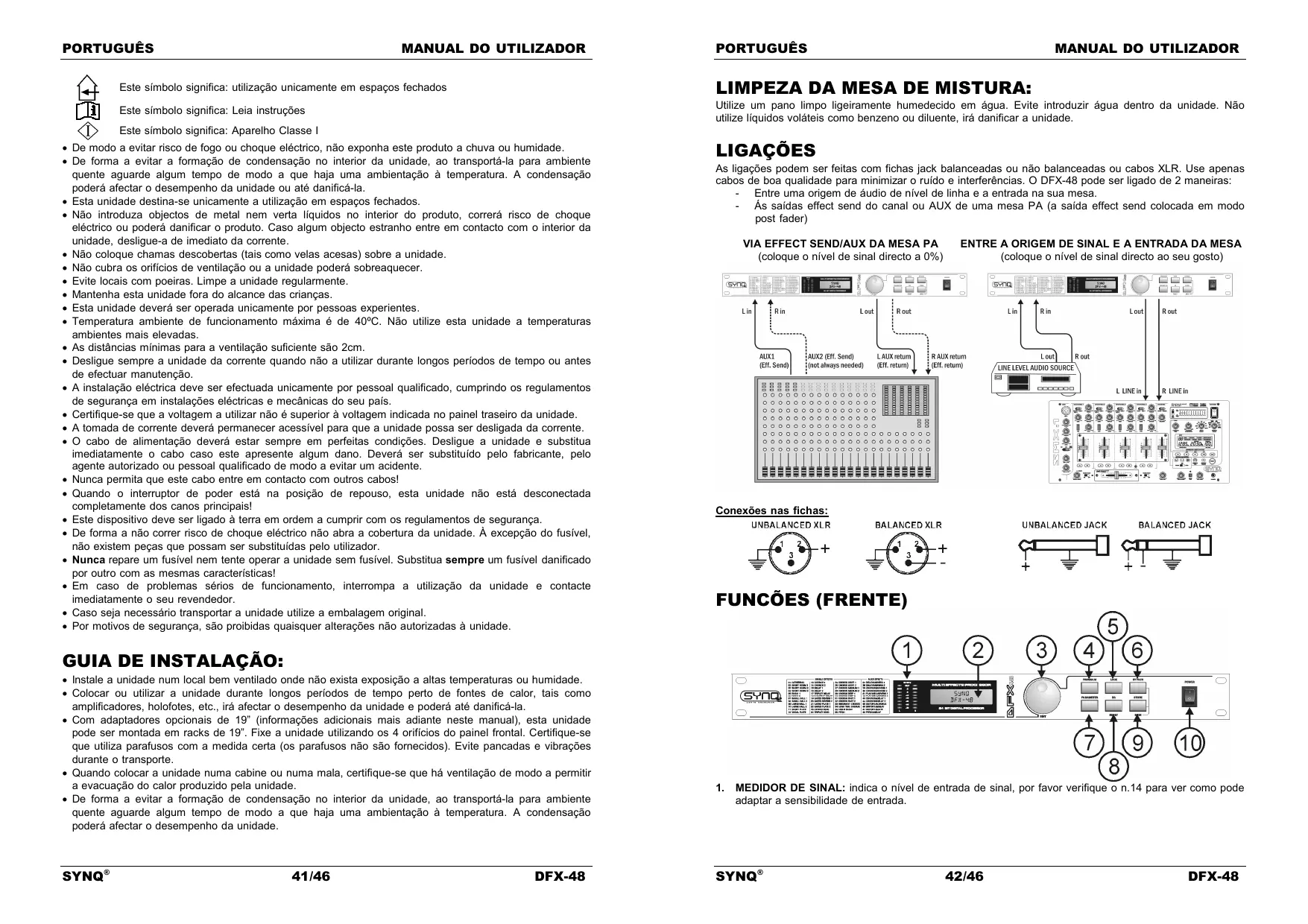 Este símbolo significa: utilização unicamente em espaços fechados LIMPEZA DA MESA DE MISTURA: Este símbolo significa: Leia instruções Utilize um pano limpo ligeiramente humedecido em água. Evite introduzir água dentro da unidade. Não utilize líquidos voláteis como benzeno ou diluente, irá danificar a unidade. Este símbolo significa: Aparelho Classe I De modo a evitar risco de fogo ou choque eléctrico, não exponha este produto a chuva ou humidade. De forma a evitar a formação de condensação no interior da unidade, ao transportá-la para ambiente quente aguarde algum tempo de modo a que haja uma ambientação à temperatura. A condensação poderá afectar o desempenho da unidade ou até danificá-la. Esta unidade destina-se unicamente a utilização em espaços fechados. Não introduza objectos de metal nem verta líquidos no interior do produto, correrá risco de choque eléctrico ou poderá danificar o produto. Caso algum objecto estranho entre em contacto com o interior da unidade, desligue-a de imediato da corrente. Não coloque chamas descobertas (tais como velas acesas) sobre a unidade. Não cubra os orifícios de ventilação ou a unidade poderá sobreaquecer. Evite locais com poeiras. Limpe a unidade regularmente. Mantenha esta unidade fora do alcance das crianças. Esta unidade deverá ser operada unicamente por pessoas experientes. Temperatura ambiente de funcionamento máxima é de 40ºC. Não utilize esta unidade a temperaturas ambientes mais elevadas. As distâncias mínimas para a ventilação suficiente são 2cm. Desligue sempre a unidade da corrente quando não a utilizar durante longos períodos de tempo ou antes de efectuar manutenção. A instalação eléctrica deve ser efectuada unicamente por pessoal qualificado, cumprindo os regulamentos de segurança em instalações eléctricas e mecânicas do seu país. Certifique-se que a voltagem a utilizar não é superior à voltagem indicada no painel traseiro da unidade. A tomada de corrente deverá permanecer acessível para que a unidade possa ser desligada da corrente. O cabo de alimentação deverá estar sempre em perfeitas condições. Desligue a unidade e substitua imediatamente o cabo caso este apresente algum dano. Deverá ser substituído pelo fabricante, pelo agente autorizado ou pessoal qualificado de modo a evitar um acidente. Nunca permita que este cabo entre em contacto com outros cabos! Quando o interruptor de poder está na posição de repouso, esta unidade não está desconectada completamente dos canos principais! Este dispositivo deve ser ligado à terra em ordem a cumprir com os regulamentos de segurança. De forma a não correr risco de choque eléctrico não abra a cobertura da unidade. À excepção do fusível, não existem peças que possam ser substituídas pelo utilizador. Nunca repare um fusível nem tente operar a unidade sem fusível. Substitua sempre um fusível danificado por outro com as mesmas características! Em caso de problemas sérios de funcionamento, interrompa a utilização da unidade e contacte imediatamente o seu revendedor. Caso seja necessário transportar a unidade utilize a embalagem original. Por motivos de segurança, são proibidas quaisquer alterações não autorizadas à unidade. LIGAÇÕES As ligações podem ser feitas com fichas jack balanceadas ou não balanceadas ou cabos XLR. Use apenas cabos de boa qualidade para minimizar o ruído e interferências. O DFX-48 pode ser ligado de 2 maneiras: - Entre uma origem de áudio de nível de linha e a entrada na sua mesa. - Ás saídas effect send do canal ou AUX de uma mesa PA (a saída effect send colocada em modo post fader) VIA EFFECT SEND/AUX DA MESA PA (coloque o nível de sinal directo a 0%) ENTRE A ORIGEM DE SINAL E A ENTRADA DA MESA (coloque o nível de sinal directo ao seu gosto) Conexões nas fichas: FUNCÕES (FRENTE) GUIA DE INSTALAÇÃO: Instale a unidade num local bem ventilado onde não exista exposição a altas temperaturas ou humidade. Colocar ou utilizar a unidade durante longos períodos de tempo perto de fontes de calor, tais como amplificadores, holofotes, etc., irá afectar o desempenho da unidade e poderá até danificá-la. Com adaptadores opcionais de 19” (informações adicionais mais adiante neste manual), esta unidade pode ser montada em racks de 19”. Fixe a unidade utilizando os 4 orifícios do painel frontal. Certifique-se que utiliza parafusos com a medida certa (os parafusos não são fornecidos). Evite pancadas e vibrações durante o transporte. Quando colocar a unidade numa cabine ou numa mala, certifique-se que há ventilação de modo a permitir a evacuação do calor produzido pela unidade. De forma a evitar a formação de condensação no interior da unidade, ao transportá-la para ambiente quente aguarde algum tempo de modo a que haja uma ambientação à temperatura. A condensação poderá afectar o desempenho da unidade. SYNQ® 41/46 DFX-48