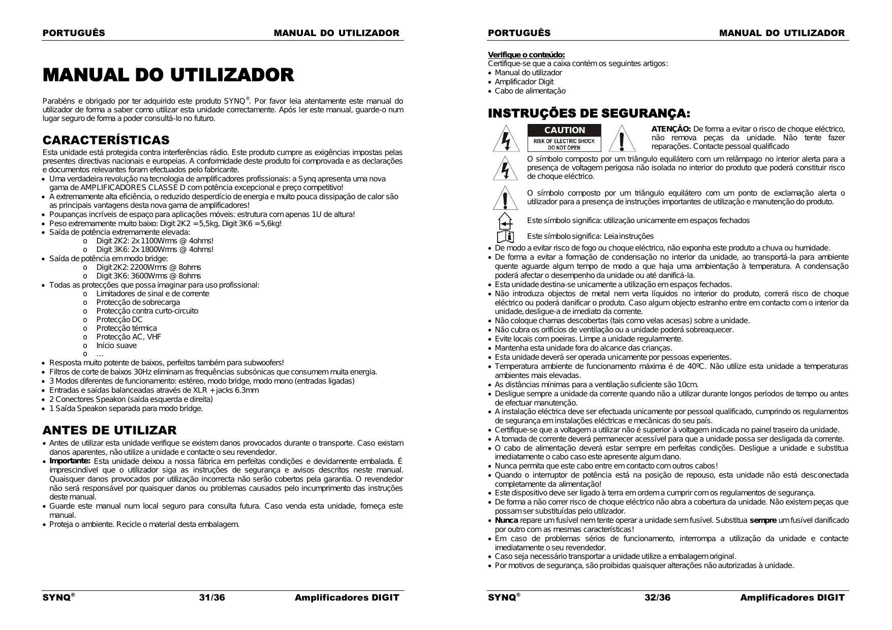 presença de voltagem perigosa nâo isolada no interior do produto que poderé constituir risco de choque eléctrico. n) © simbolo composto por um tiängulo equilétero com um ponto de exclamaçäo alerta o (l \ _utilizador para a presença de instruçôes importantes de utlizaçäo e manutençäo do produto. A Este simbolo significa: utilizaçäo unicamente em espaços fechados Este simbolo signiica: Leiainstruçées + De modo a evitar isco de fogo ou choque eléctico, näo exponha este produto a chuva ou humidade + De forma a evitar a fomaçäo de condensaçäo no interior da unidade, ao transporté-la para ambiente quente aguarde algum tempo de modo a que haja uma ambientaçäo à temperatura. À condensaçäo poderé afectar o desempenho da unidade ou até danificé-la. + Esta unidade destina-se unicamente a utlizaçäo em espaços fechados. + Näo introduza objectos de metal nem verta liquidos no interior do produto, correré risco de choque eléctico ou poderé danificar o produto. Caso algum objecto estranho entre em contacto com o interior da unidade, desligue-a de imediato da corrente. + Näo coloque chamas descobertas (tais como velas acesas) sobre a unidade. + Näo cubra os oriicios de ventilaçäo ou a unidade poderé sobreaquecer. + Evite locais com poeiras. Limpe a unidade regularmente. + Mantenha esta unidade fora do alcance das crianças. + Esta unidade deveré ser operada unicamente por pessoas experientes. + Temperatura ambiente de funcionamento méxima é de 402C. Näo utlize esta unidade a temperatures ambientes mais elevadas. + AS disténcias minimas para a ventilaçäo sufñciente säo 10cm. + Desligue sempre a unidade da corrente quando näo a utlizar durante longos perfodos de tempo ou antes de efectuar manutençäo. + Ainstalaçäo eléctrica deve ser efectuada unicamente por pessoal qualificado, cumprindo os regulamentos de segurança eminstalaçôes eléctricas e mecänicas do seu pais. + Certifique-se que a voltagem a utiizar no é superior à voltagem indicada no painel traseiro da unidade + A tomada de corrente deveré permanecer acessivel para que a unidade possa ser desligada da corrente. + O cabo de alimentaçäo deveré esta sempre em perfeitas condiçôes. Desligue à unidade e substitua imediatamente o cabo caso este apresente algum dano. + Nunca permita que este cabo entre em contacto com outros cabos! + Quando o intemuptor de poténcia esté na posiçäo de repouso, esta unidade nâo esté desconectada corpletamente da alimentaçäo! + Este dispositivo deve ser ligado à terra em ordema cumprir com os regulamentos de segurança. + De forma a nâo correr risco de choque eléctrico näo abra a cobertura da unidade. Näo existem peças que possamser substituidas pelo utilizador. + Nunca repare um fusivel nem tente operar a unidade semfusivel. Substitua sempre umfusivel danificado por outro com as mesmas caracteristicas ! + Em caso de problemes sérios de funcionamento, interompa a utlizaçäo da unidade e contacte imediatamente o seu revendedor. + Caso seja necessério transportar a unidade utlize a embalagem original + Por motivos de segurança, so proibidas quaisquer alteraçôes nâo autorizadas à unidade. SYNQ° 32/36 Ampl icadores DIGIT