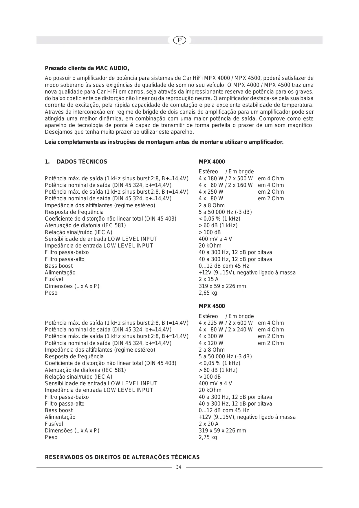 Prezado cliente da MAC AUDIO, Ao possuir o amplificador de potência para sistemas de Car HiFi MPX 4000 / MPX 4500, poderá satisfazer de modo soberano às suas exigências de qualidade de som no seu veículo. O MPX 4000 / MPX 4500 traz uma nova qualidade para Car HiFi em carros, seja através da impressionante reserva de potência para os graves, do baixo coeficiente de distorção não linear ou da reprodução neutra. O amplificador destaca-se pela sua baixa corrente de excitação, pela rápida capacidade de comutação e pela excelente estabilidade de temperatura. Através da interconexão em regime de brigde de dois canais de amplificação para um amplificador pode ser atingida uma melhor dinâmica, em combinação com uma maior potência de saída. Comprove como este aparelho de tecnologia de ponta é capaz de transmitir de forma perfeita o prazer de um som magnífico. Desejamos que tenha muito prazer ao utilizar este aparelho. Leia completamente as instruções de montagem antes de montar e utilizar o amplificador.