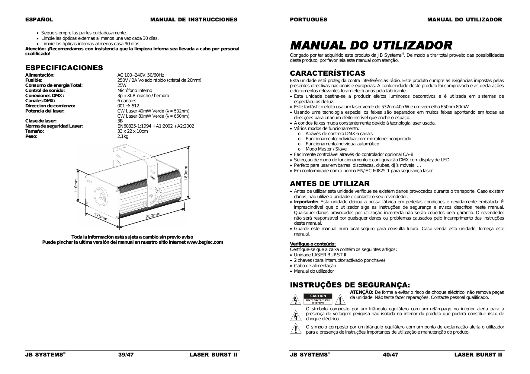 Toda la información está sujeta a cambio sin previo aviso Puede pinchar la ultima versión del manual en nuestro sitio internet www.beglec.com Antes de utilizar esta unidade verifique se existem danos provocados durante o transporte. Caso existam danos, não utilize a unidade e contacte o seu revendedor. Importante: Esta unidade deixou a nossa fábrica em perfeitas condições e devidamente embalada. É imprescindível que o utilizador siga as instruções de segurança e avisos descritos neste manual. Quaisquer danos provocados por utilização incorrecta não serão cobertos pela garantia. O revendedor não será responsável por quaisquer danos ou problemas causados pelo incumprimento das instruções deste manual. Guarde este manual num local seguro para consulta futura. Caso venda esta unidade, forneça este manual. Verifique o conteúdo: Certifique-se que a caixa contém os seguintes artigos: Unidade LASER BURST II 2 chaves (para interruptor activado por chave) Cabo de alimentação Manual do utilizador INSTRUÇÕES DE SEGURANÇA: CAUTION ATENÇÃO: De forma a evitar o risco de choque eléctrico, não remova peças da unidade. Não tente fazer reparações. Contacte pessoal qualificado. O símbolo composto por um triângulo equilátero com um relâmpago no interior alerta para a presença de voltagem perigosa não isolada no interior do produto que poderá constituir risco de choque eléctrico. O símbolo composto por um triângulo equilátero com um ponto de exclamação alerta o utilizador para a presença de instruções importantes de utilização e manutenção do produto. JB SYSTEMS® 39/47