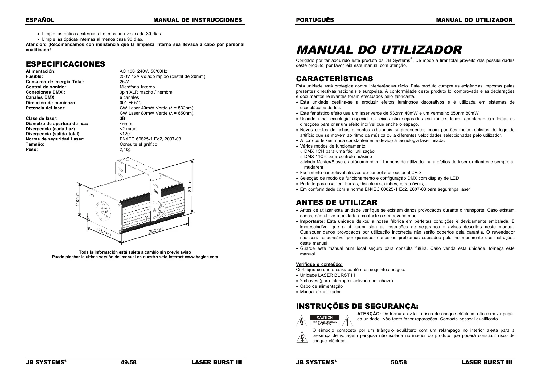 Toda la información está sujeta a cambio sin previo aviso Puede pinchar la ultima versión del manual en nuestro sitio internet www.beglec.com Antes de utilizar esta unidade verifique se existem danos provocados durante o transporte. Caso existam danos, não utilize a unidade e contacte o seu revendedor. Importante: Esta unidade deixou a nossa fábrica em perfeitas condições e devidamente embalada. É imprescindível que o utilizador siga as instruções de segurança e avisos descritos neste manual. Quaisquer danos provocados por utilização incorrecta não serão cobertos pela garantia. O revendedor não será responsável por quaisquer danos ou problemas causados pelo incumprimento das instruções deste manual. Guarde este manual num local seguro para consulta futura. Caso venda esta unidade, forneça este manual. Verifique o conteúdo: Certifique-se que a caixa contém os seguintes artigos: Unidade LASER BURST III 2 chaves (para interruptor activado por chave) Cabo de alimentação Manual do utilizador INSTRUÇÕES DE SEGURANÇA: CAUTION ATENÇÃO: De forma a evitar o risco de choque eléctrico, não remova peças da unidade. Não tente fazer reparações. Contacte pessoal qualificado. O símbolo composto por um triângulo equilátero com um relâmpago no interior alerta para a presença de voltagem perigosa não isolada no interior do produto que poderá constituir risco de choque eléctrico. JB SYSTEMS® 49/58