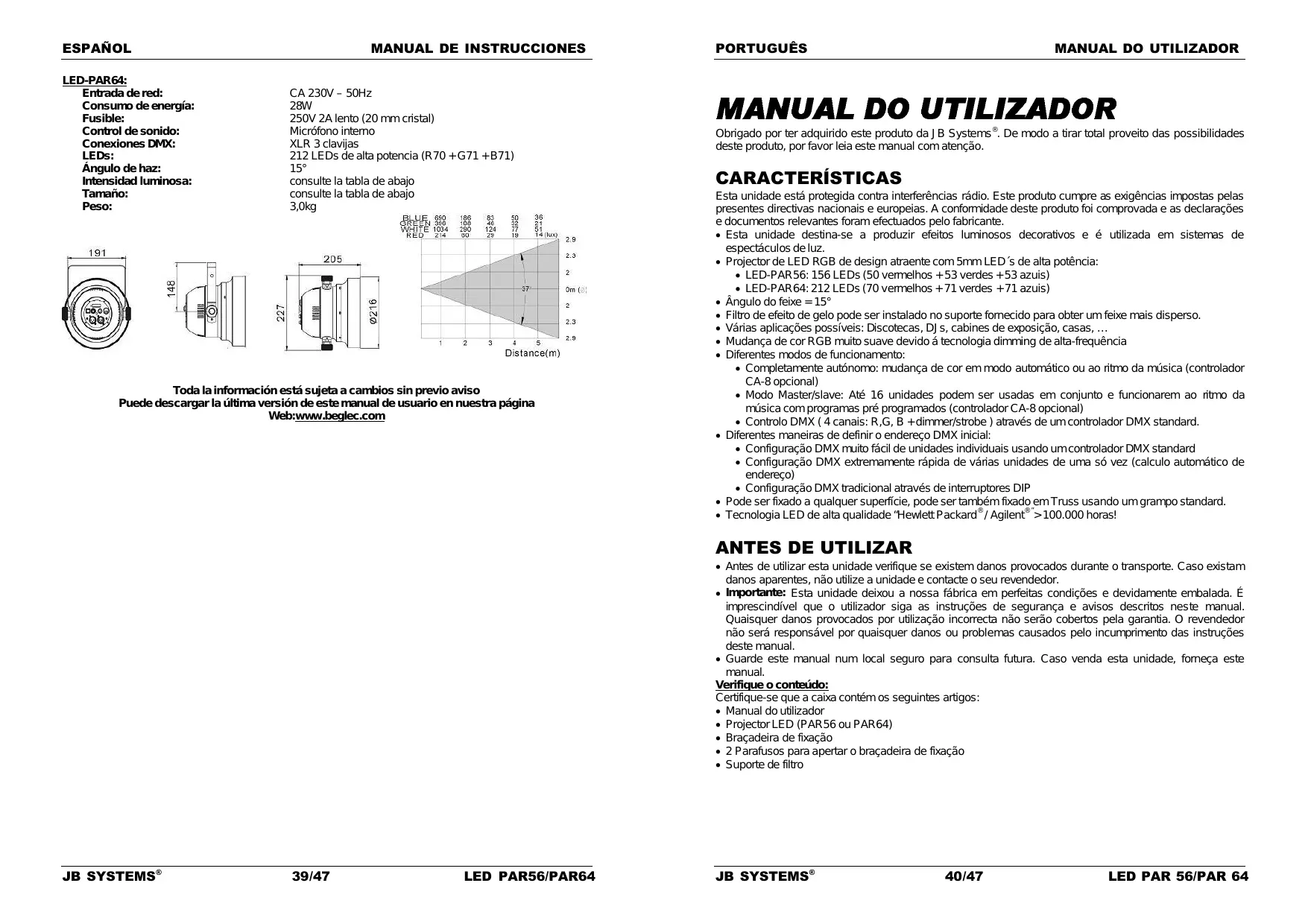 ambiente húmido, com fumo ou poeirento dará origem a uma maior acumulação de impurezas nas ópticas da unidade. Utilize um pano macio e um limpa-vidros normal na limpeza da unidade. Seque sempre as peças cuidadosamente. Limpe as ópticas externas pelo menos uma vez em cada 30 dias. Atenção: Recomendamos vivamente que a limpeza do interior da unidade seja efectuada por pessoal qualificado! ESPECIFICAÇÕES LED PAR 56 Fonte de Alimentação: Consumo de potência: Fusível: Controlo de som: Conexões DMX: LEDs: Ângulo do Feixe: Intensidade luminosa: Dimensões: Peso: AC 230V, 50Hz 21 Watt 250V. A Fusão Lenta (20mm vidro) Microfone interno XLR 3pin 212 LEDs de alta potência ( R50 + G53 + B53 ) 15° (mais disperso com o filtro especial de gelo) veja gráfico abaixo veja gráfico abaixo 2,5 kg LED PAR 64 Fonte de Alimentação: Consumo de potência: Fusível: Controlo de som: Conexões DMX: LEDs: Ângulo do Feixe: Intensidade luminosa: Dimensões: Peso: AC 230V, 50Hz 28 Watt 250V. A Fusão Lenta (20mm vidro) Microfone interno XLR 3pin 212 LEDs de alta potência (R70 + G71 + B71) 15° (mais disperso com o filtro especial de gelo) veja gráfico abaixo veja gráfico abaixo 3,0 kg Estas informações estão sujeitas a alterações sem aviso prévio Pode fazer download da versão mais recente deste manual no nosso site: www.beglec.com JB SYSTEMS® 47/47