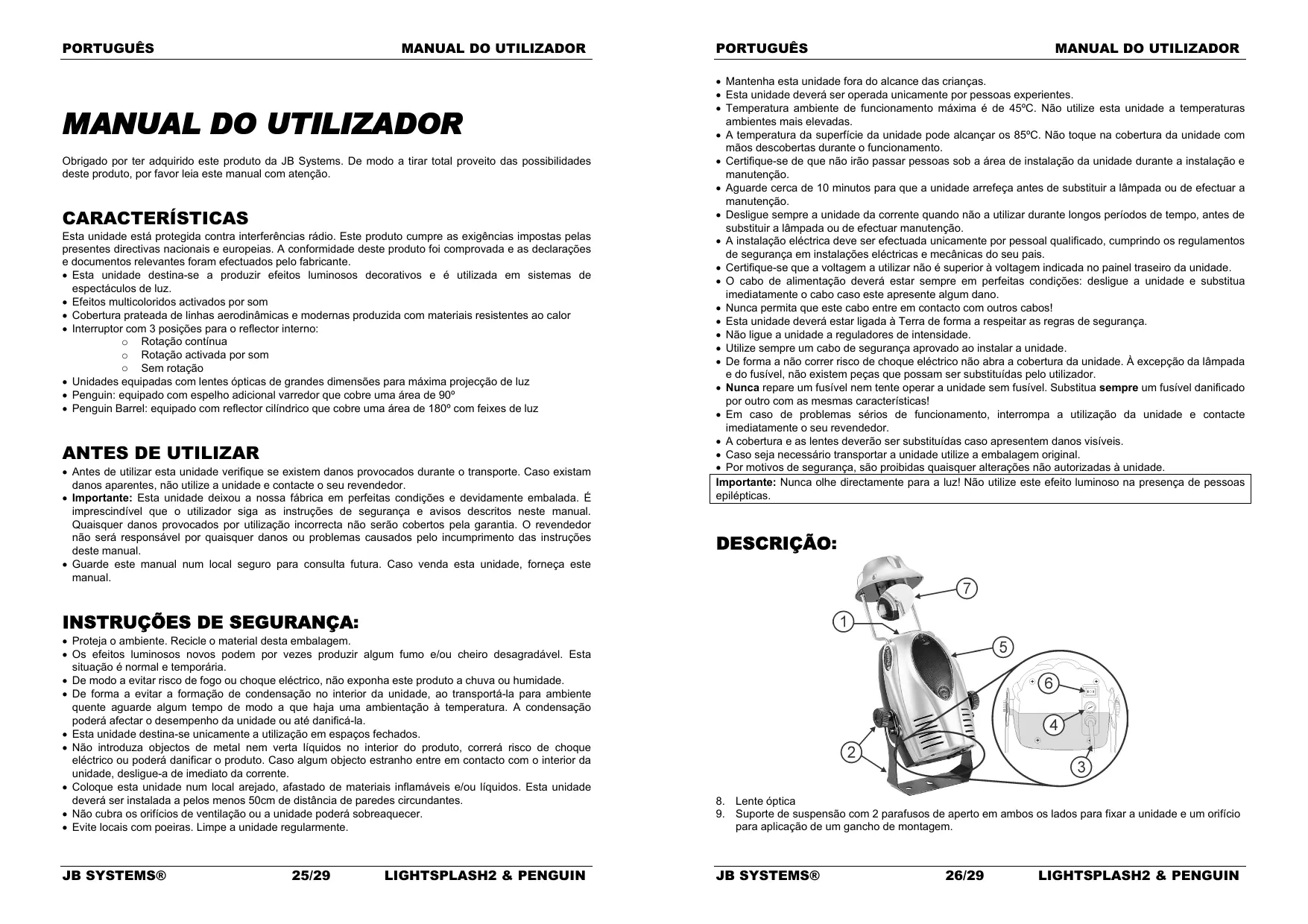 para aplicação de um gancho de montagem. JB SYSTEMS® JB SYSTEMS® 25/29 LIGHTSPLASH2 & PENGUIN 26/29 LIGHTSPLASH2 & PENGUIN PORTUGUÊS