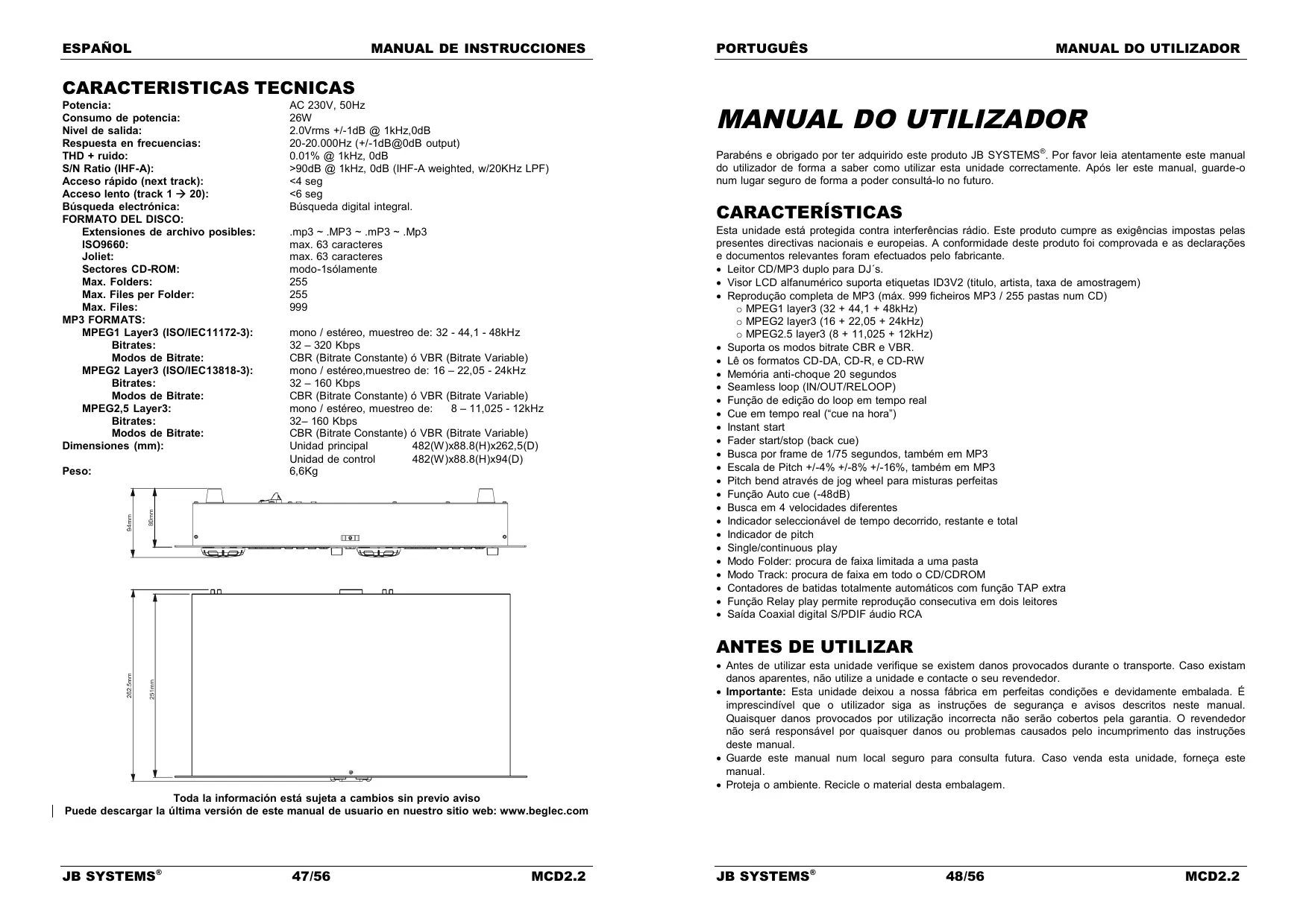 Antes de utilizar esta unidade verifique se existem danos provocados durante o transporte. Caso existam danos aparentes, não utilize a unidade e contacte o seu revendedor. Importante: Esta unidade deixou a nossa fábrica em perfeitas condições e devidamente embalada. É imprescindível que o utilizador siga as instruções de segurança e avisos descritos neste manual. Quaisquer danos provocados por utilização incorrecta não serão cobertos pela garantia. O revendedor não será responsável por quaisquer danos ou problemas causados pelo incumprimento das instruções deste manual. Guarde este manual num local seguro para consulta futura. Caso venda esta unidade, forneça este manual. Proteja o ambiente. Recicle o material desta embalagem. Toda la información está sujeta a cambios sin previo aviso Puede descargar la última versión de este manual de usuario en nuestro sitio web: www.beglec.com JB SYSTEMS® 47/56 MCD2.2 JB SYSTEMS® 48/56 MCD2.2 PORTUGUÊS