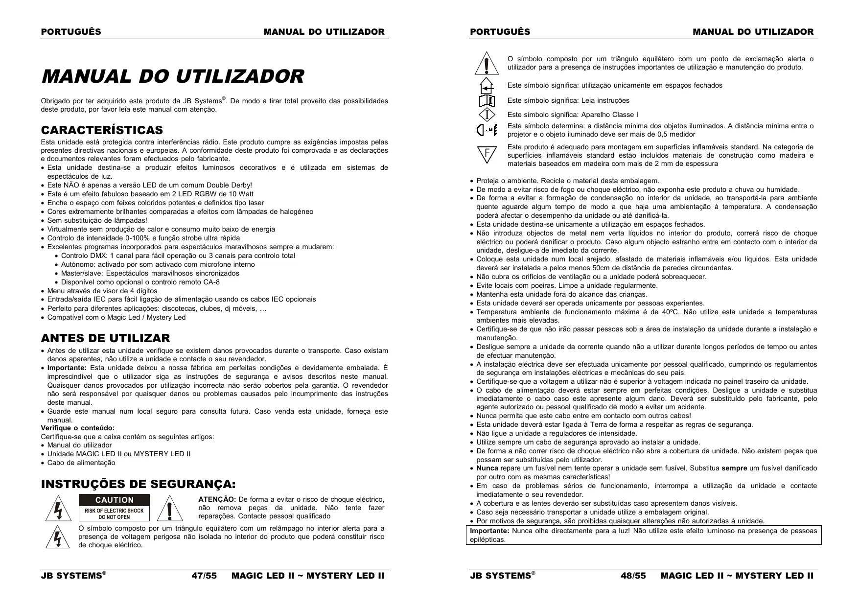 Antes de utilizar esta unidade verifique se existem danos provocados durante o transporte. Caso existam danos aparentes, não utilize a unidade e contacte o seu revendedor. Importante: Esta unidade deixou a nossa fábrica em perfeitas condições e devidamente embalada. É imprescindível que o utilizador siga as instruções de segurança e avisos descritos neste manual. Quaisquer danos provocados por utilização incorrecta não serão cobertos pela garantia. O revendedor não será responsável por quaisquer danos ou problemas causados pelo incumprimento das instruções deste manual. Guarde este manual num local seguro para consulta futura. Caso venda esta unidade, forneça este manual. Verifique o conteúdo: Certifique-se que a caixa contém os seguintes artigos: Manual do utilizador Unidade MAGIC LED II ou MYSTERY LED II Cabo de alimentação INSTRUÇÕES DE SEGURANÇA: CAUTION ATENÇÃO: De forma a evitar o risco de choque eléctrico, não remova peças da unidade. Não tente fazer reparações. Contacte pessoal qualificado O símbolo composto por um triângulo equilátero com um relâmpago no interior alerta para a presença de voltagem perigosa não isolada no interior do produto que poderá constituir risco de choque eléctrico. JB SYSTEMS® 47/55