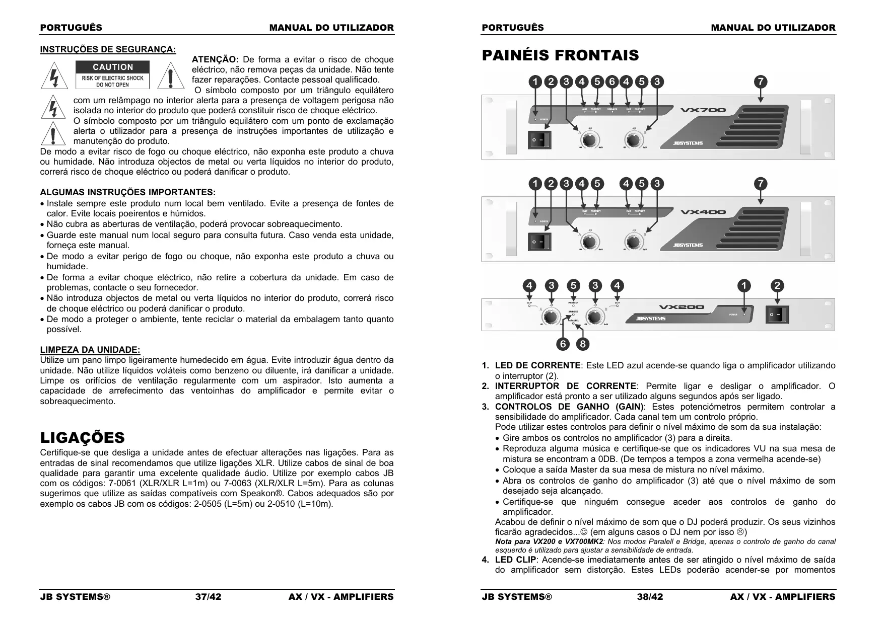 - De modo a proteger o ambiente, tente reciclar o material da embalagem tanto quanto possível. LIMPEZA DA UNIDADE: Utilize um pano limpo ligeiramente humedecido em água. Evite introduzir água dentro da unidade. Não utilize líquidos voláteis como benzeno ou diluente, irá danificar a unidade. Limpe os orifícios de ventilação regularmente com um aspirador. Isto aumenta a capacidade de arrefecimento das ventoinhas do amplificador e permite evitar o sobreaquecimento. LIGAÇÕES Certifique-se que desliga a unidade antes de efectuar alterações nas ligações. Para as entradas de sinal recomendamos que utilize ligações XLR. Utilize cabos de sinal de boa qualidade para garantir uma excelente qualidade áudio. Utilize por exemplo cabos JB com os códigos: 7-0061 (XLR/XLR L=1m) ou 7-0063 (XLR/XLR L=5m). Para as colunas sugerimos que utilize as saídas compatíveis com Speakon®. Cabos adequados são por exemplo os cabos JB com os códigos: 2-0505 (L=5m) ou 2-0510 (L=10m).