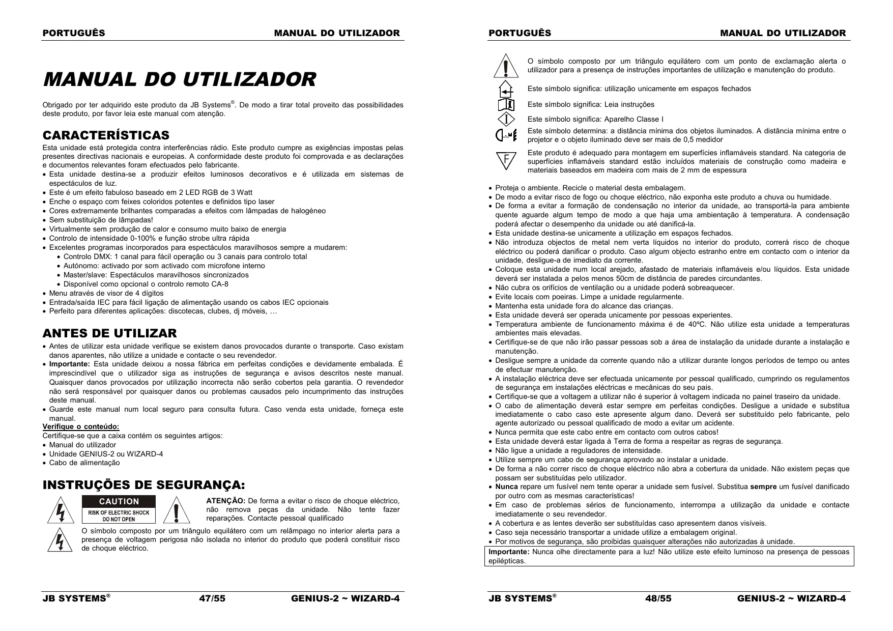 Antes de utilizar esta unidade verifique se existem danos provocados durante o transporte. Caso existam danos aparentes, não utilize a unidade e contacte o seu revendedor. Importante: Esta unidade deixou a nossa fábrica em perfeitas condições e devidamente embalada. É imprescindível que o utilizador siga as instruções de segurança e avisos descritos neste manual. Quaisquer danos provocados por utilização incorrecta não serão cobertos pela garantia. O revendedor não será responsável por quaisquer danos ou problemas causados pelo incumprimento das instruções deste manual. Guarde este manual num local seguro para consulta futura. Caso venda esta unidade, forneça este manual. Verifique o conteúdo: Certifique-se que a caixa contém os seguintes artigos: Manual do utilizador Unidade GENIUS-2 ou WIZARD-4 Cabo de alimentação INSTRUÇÕES DE SEGURANÇA: CAUTION ATENÇÃO: De forma a evitar o risco de choque eléctrico, não remova peças da unidade. Não tente fazer reparações. Contacte pessoal qualificado O símbolo composto por um triângulo equilátero com um relâmpago no interior alerta para a presença de voltagem perigosa não isolada no interior do produto que poderá constituir risco de choque eléctrico. JB SYSTEMS® 47/55 GENIUS-2 ~ WIZARD-4 Este símbolo significa: Aparelho Classe I Este produto é adequado para montagem em superfícies inflamáveis standard. Na categoria de superfícies inflamáveis standard estão incluídos materiais de construção como madeira e materiais baseados em madeira com mais de 2 mm de espessura Proteja o ambiente. Recicle o material desta embalagem. De modo a evitar risco de fogo ou choque eléctrico, não exponha este produto a chuva ou humidade. De forma a evitar a formação de condensação no interior da unidade, ao transportá-la para ambiente quente aguarde algum tempo de modo a que haja uma ambientação à temperatura. A condensação poderá afectar o desempenho da unidade ou até danificá-la. Esta unidade destina-se unicamente a utilização em espaços fechados. Não introduza objectos de metal nem verta líquidos no interior do produto, correrá risco de choque eléctrico ou poderá danificar o produto. Caso algum objecto estranho entre em contacto com o interior da unidade, desligue-a de imediato da corrente. Coloque esta unidade num local arejado, afastado de materiais inflamáveis e/ou líquidos. Esta unidade deverá ser instalada a pelos menos 50cm de distância de paredes circundantes. Não cubra os orifícios de ventilação ou a unidade poderá sobreaquecer. Evite locais com poeiras. Limpe a unidade regularmente. Mantenha esta unidade fora do alcance das crianças. Esta unidade deverá ser operada unicamente por pessoas experientes. Temperatura ambiente de funcionamento máxima é de 40ºC. Não utilize esta unidade a temperaturas ambientes mais elevadas. Certifique-se de que não irão passar pessoas sob a área de instalação da unidade durante a instalação e manutenção. Desligue sempre a unidade da corrente quando não a utilizar durante longos períodos de tempo ou antes de efectuar manutenção. A instalação eléctrica deve ser efectuada unicamente por pessoal qualificado, cumprindo os regulamentos de segurança em instalações eléctricas e mecânicas do seu pais. Certifique-se que a voltagem a utilizar não é superior à voltagem indicada no painel traseiro da unidade. O cabo de alimentação deverá estar sempre em perfeitas condições. Desligue a unidade e substitua imediatamente o cabo caso este apresente algum dano. Deverá ser substituído pelo fabricante, pelo agente autorizado ou pessoal qualificado de modo a evitar um acidente. Nunca permita que este cabo entre em contacto com outros cabos! Esta unidade deverá estar ligada à Terra de forma a respeitar as regras de segurança. Não ligue a unidade a reguladores de intensidade. Utilize sempre um cabo de segurança aprovado ao instalar a unidade. De forma a não correr risco de choque eléctrico não abra a cobertura da unidade. Não existem peças que possam ser substituídas pelo utilizador. Nunca repare um fusível nem tente operar a unidade sem fusível. Substitua sempre um fusível danificado por outro com as mesmas características! Em caso de problemas sérios de funcionamento, interrompa a utilização da unidade e contacte imediatamente o seu revendedor. A cobertura e as lentes deverão ser substituídas caso apresentem danos visíveis. Caso seja necessário transportar a unidade utilize a embalagem original. Por motivos de segurança, são proibidas quaisquer alterações não autorizadas à unidade. Importante: Nunca olhe directamente para a luz! Não utilize este efeito luminoso na presença de pessoas epilépticas. JB SYSTEMS® 48/55 GENIUS-2 ~ WIZARD-4 PORTUGUÊS