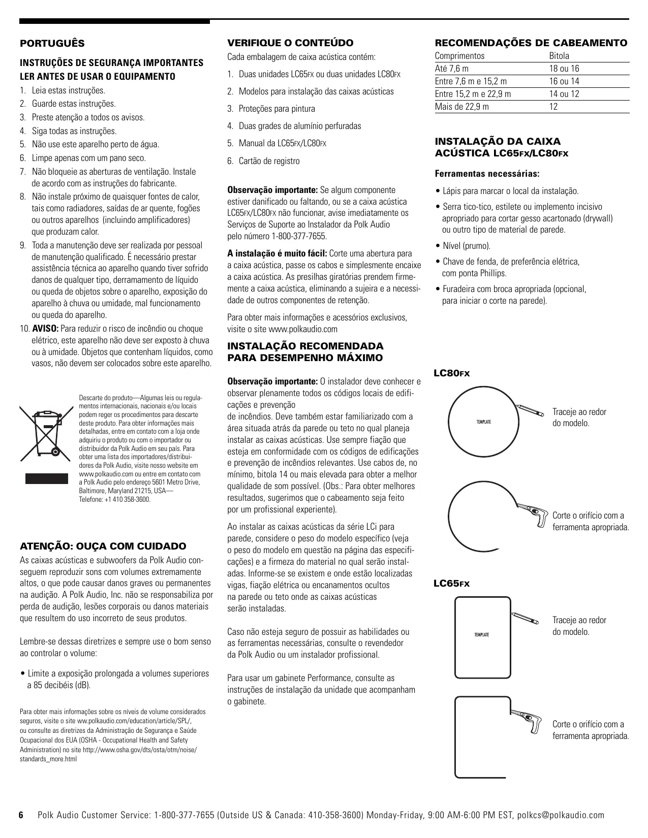 Observação importante: O instalador deve conhecer e observar plenamente todos os códigos locais de edificações e prevenção de incêndios. Deve também estar familiarizado com a área situada atrás da parede ou teto no qual planeja instalar as caixas acústicas. Use sempre fiação que esteja em conformidade com os códigos de edificações e prevenção de incêndios relevantes. Use cabos de, no mínimo, bitola 14 ou mais elevada para obter a melhor qualidade de som possível. (Obs.: Para obter melhores resultados, sugerimos que o cabeamento seja feito por um profissional experiente). Ao instalar as caixas acústicas da série LCi para parede, considere o peso do modelo específico (veja o peso do modelo em questão na página das especificações) e a firmeza do material no qual serão instaladas. Informe-se se existem e onde estão localizadas vigas, fiação elétrica ou encanamentos ocultos na parede ou teto onde as caixas acústicas serão instaladas. Caso não esteja seguro de possuir as habilidades ou as ferramentas necessárias, consulte o revendedor da Polk Audio ou um instalador profissional. LC80FX Traceje ao redor do modelo. Corte o orifício com a ferramenta apropriada. LC65FX Traceje ao redor do modelo. Para usar um gabinete Performance, consulte as instruções de instalação da unidade que acompanham o gabinete. Corte o orifício com a ferramenta apropriada. Polk Audio Customer Service: 1-800-377-7655 (Outside US & Canada: 410-358-3600) Monday-Friday, 9:00 AM-6:00 PM EST, polkcs@polkaudio.com