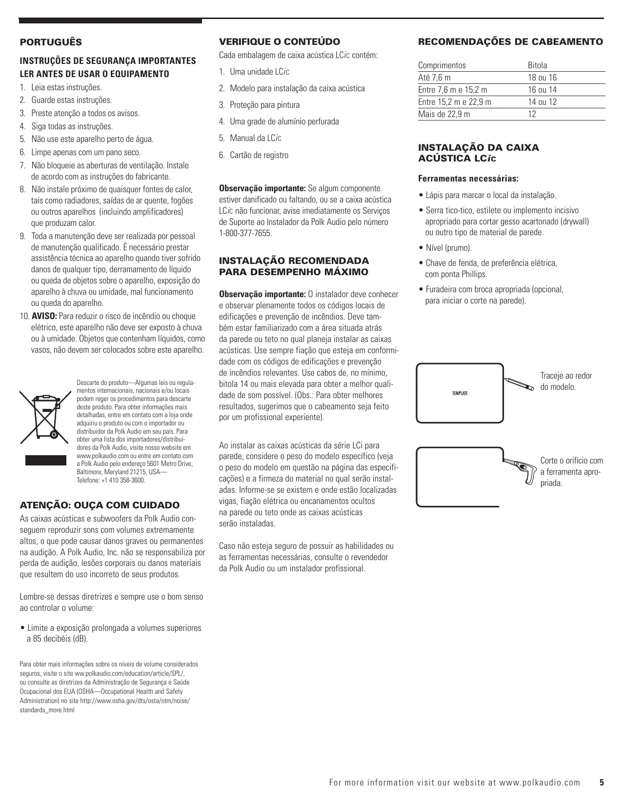 - Limite a exposição prolongada a volumes superiores a 85 decibéis (dB). Para obter mais informações sobre os níveis de volume considerados seguros, visite o site ww.polkaudio.com/education/article/SPL/, ou consulte as diretrizes da Administração de Segurança e Saúde Ocupacional dos EUA (OSHA—Occupational Health and Safety Administration) no site http://www.osha.gov/dts/osta/otm/noise/ standards_more.html For more information visit our website at www.polkaudio.com