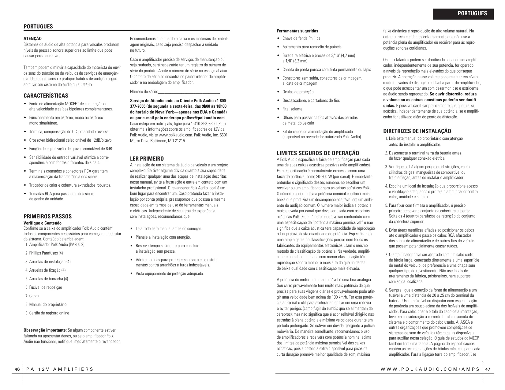 - Óculos de proteção Serviço de Atendimento ao Cliente Polk Audio +1 800377-7655 (de segunda a sexta-feira, das 9h00 às 18h00 do horário de Nova York—apenas nos EUA e Canadá) ou por e-mail pelo endereço polkcs@polkaudio.com. Caso esteja em outro país, ligue para 1-410-358-3600. Para obter mais informações sobre os amplificadores de 12V da Polk Audio, visite www.polkaudio.com. Polk Audio, Inc. 5601 Metro Drive Baltimore, MD 21215