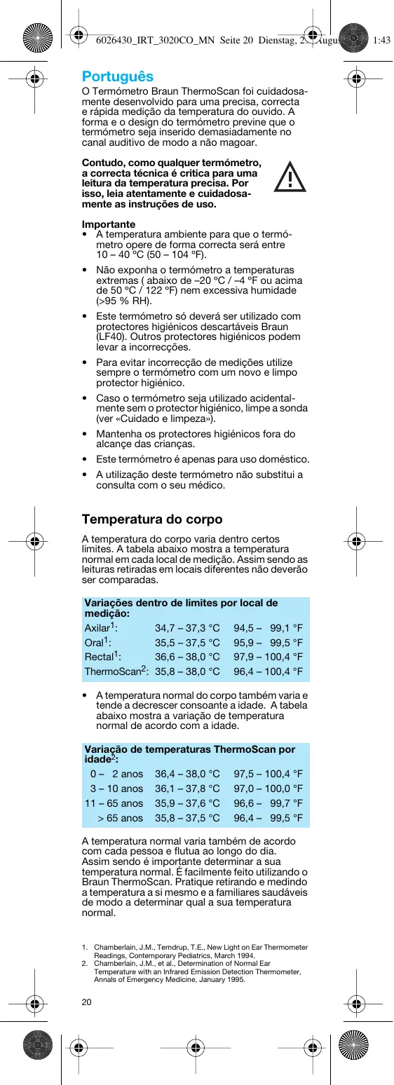 - A utilização deste termómetro não substitui a consulta com o seu médico. Temperatura do corpo A temperatura do corpo varia dentro certos limites. A tabela abaixo mostra a temperatura normal em cada local de medição. Assim sendo as leituras retiradas em locais diferentes não deverão ser comparadas. Variações dentro de limites por local de medição: 34,7 – 37,3 °C 94,5 – 99,1 °F Axilar1: 35,5 – 37,5 °C 95,9 – 99,5 °F Oral1: 36,6 – 38,0 °C 97,9 – 100,4 °F Rectal1: ThermoScan2: 35,8 – 38,0 °C 96,4 – 100,4 °F