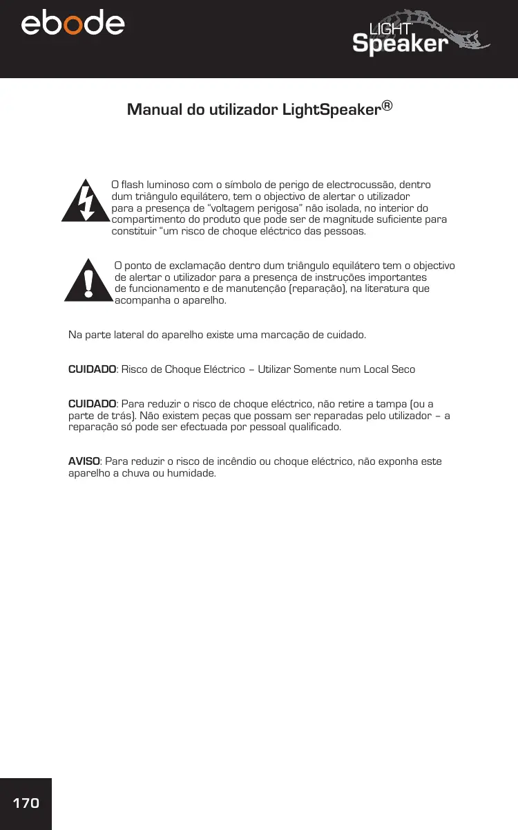 Obrigado por ter escolhido o LightSpeaker® da ebode electronics. Escolheu um dos sistemas录音 patenteado e mais exclusivo em todo o mundo. Com instalacao e funciona adequado, poderá beneficiar de muitos anos de utilizesao sem problemas. Ebode electronics vende numerousos produits para utilizear no interior ou exterior da sua habitaoa. Para ver a gama completa de produits da ebode electronics, visite a)nossa pagina internet em: www.ebodeelectronics.eu.