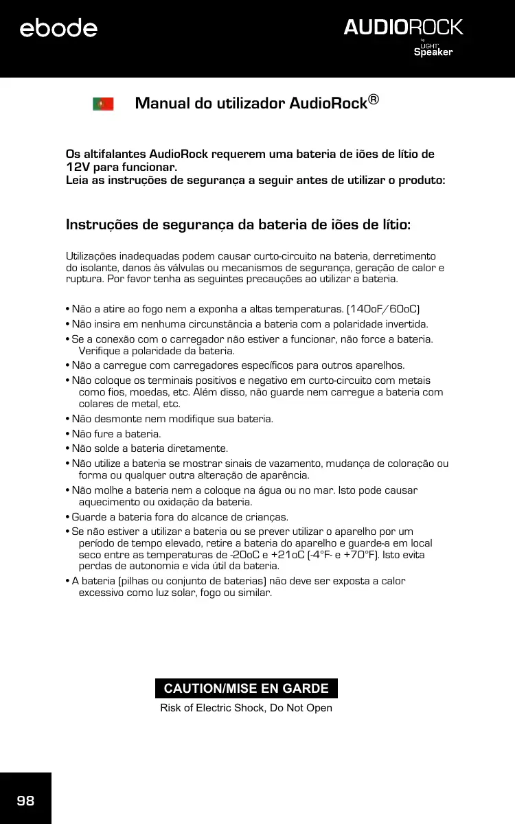 Obrigado pela escolha do AudioRock™ portátil sem fios da ebode electronics. Se adequadamente instalado e utilizes, o produits durará por various anos sem problemas. A ebode electronics Oferece他们在 altifalantes para utilizes em ambientes internos ou externos. Para ver a lista completenessa de produits da ebode electronics, visite-nos na Internet em: www.ebodeelectronics.eu.