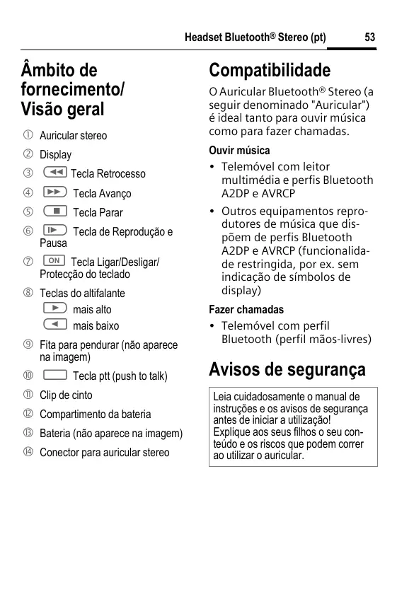 Headset Bluetooth® Stereo (pt) 53 Âmbito de fornecimento/ Visäo geral Auricular stereo @ Display CI Tecla Retrocesso >) Tecla Avango CM] Tecla Parar (>) Tecla de Reproduçäo e Pausa Tecla Ligar/Desligar! Protecçäo do teclado @ Teclas do altalante CE) mais alto CÆT mais baixo © Fita para pendurar (nâo aparece na imagem) ® C2] Tecia ptt (push to talk) @ Clip de cinto @ Compartimento da bateria ® Bateria(näo aparece na imagem) ® Conector para auricular stereo Compatibilidade OAuricular Bluetooth® Stereo (a seguir denominado "Auricular") é ideal tanto para ouvir müsica como para fazer chamadas. Ouvir müsica Telemôvel com leitor multimédia e perfis Bluetooth A2DP e AVRCP Outros equipamentos repro- dutores de musica que dis- pôem de perfis Bluetooth A2DP e AVRCP (funcionalida- de restringida, por ex. sem indicaçäo de simbolos de display) Fazer chamadas + Telemôvel com perfil Bluetooth (perfil mäos-livres) Avisos de segurança Leia cuidadosamente o manual de instruçges e os avisos de segurança antes de iniciar à utlizaçéol Explique aos seus flhos o seu con- teüdo e os riscos que podem correr ao utlizar o auricular.