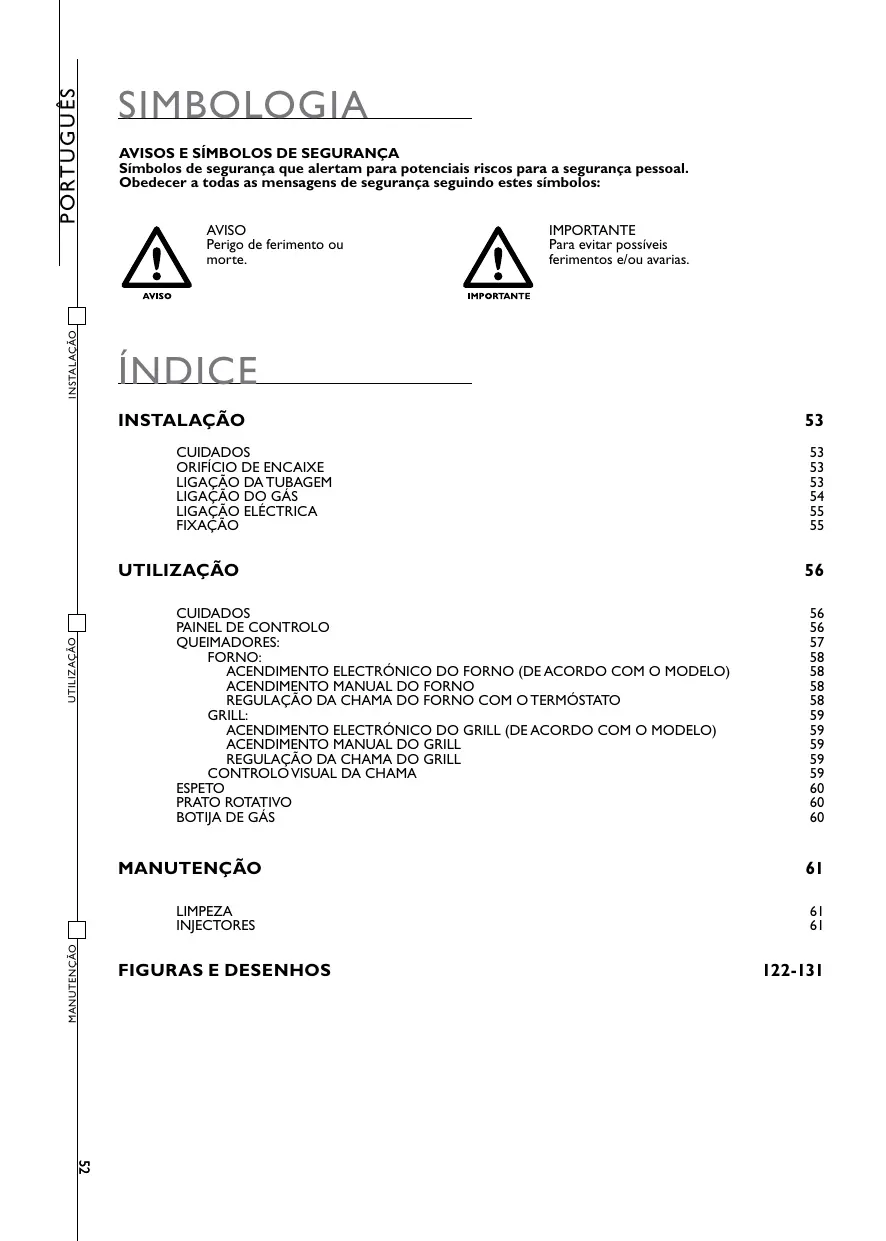 Os símbolos seguintes indicam o queimador que corresponde ao manípulo. NOTA: Diferentes modelos poderão ter manípulos e símbolos diferentes. ESTE SÍMBOLO ENCONTRA-SE JUNTO AO MANÍPULO DO QUEIMADOR DO FORNO ESTE SÍMBOLO ENCONTRA-SE JUNTO AO MANÍPULO DO QUEIMADOR DO GRILL Os símbolos seguintes indicam a regulação do queimador que corresponde à posição do manípulo. NOTA: Diferentes modelos poderão ter manípulos e símbolos diferentes. MANUTENÇÃO