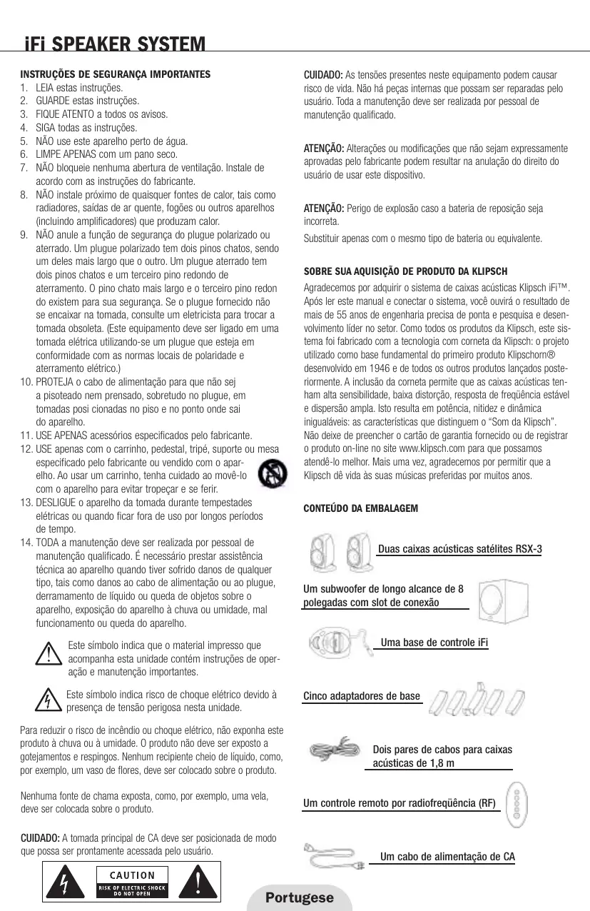 CUIDADO: As tensões presentes neste equipamento podem causar risco de vida. Não há peças internas que possam ser reparadas pelo usuário. Toda a manutenção deve ser realizada por pessoal de manutenção qualificado. ATENÇÃO: Alterações ou modificações que não sejam expressamente aprovadas pelo fabricante podem resultar na anulação do direito do usuário de usar este dispositivo. ATENÇÃO: Perigo de explosão caso a bateria de reposição seja incorreta. Substituir apenas com o mesmo tipo de bateria ou equivalente. SOBRE SUA AQUISIÇÃO DE PRODUTO DA KLIPSCH Agradecemos por adquirir o sistema de caixas acústicas Klipsch iFi™. Após ler este manual e conectar o sistema, você ouvirá o resultado de mais de 55 anos de engenharia precisa de ponta e pesquisa e desenvolvimento líder no setor. Como todos os produtos da Klipsch, este sistema foi fabricado com a tecnologia com corneta da Klipsch: o projeto utilizado como base fundamental do primeiro produto Klipschorn® desenvolvido em 1946 e de todos os outros produtos lançados posteriormente. A inclusão da corneta permite que as caixas acústicas tenham alta sensibilidade, baixa distorção, resposta de freqüência estável e dispersão ampla. Isto resulta em potência, nitidez e dinâmica inigualáveis: as características que distinguem o “Som da Klipsch”. Não deixe de preencher o cartão de garantia fornecido ou de registrar o produto on-line no site www.klipsch.com para que possamos atendê-lo melhor. Mais uma vez, agradecemos por permitir que a Klipsch dê vida às suas músicas preferidas por muitos anos.
