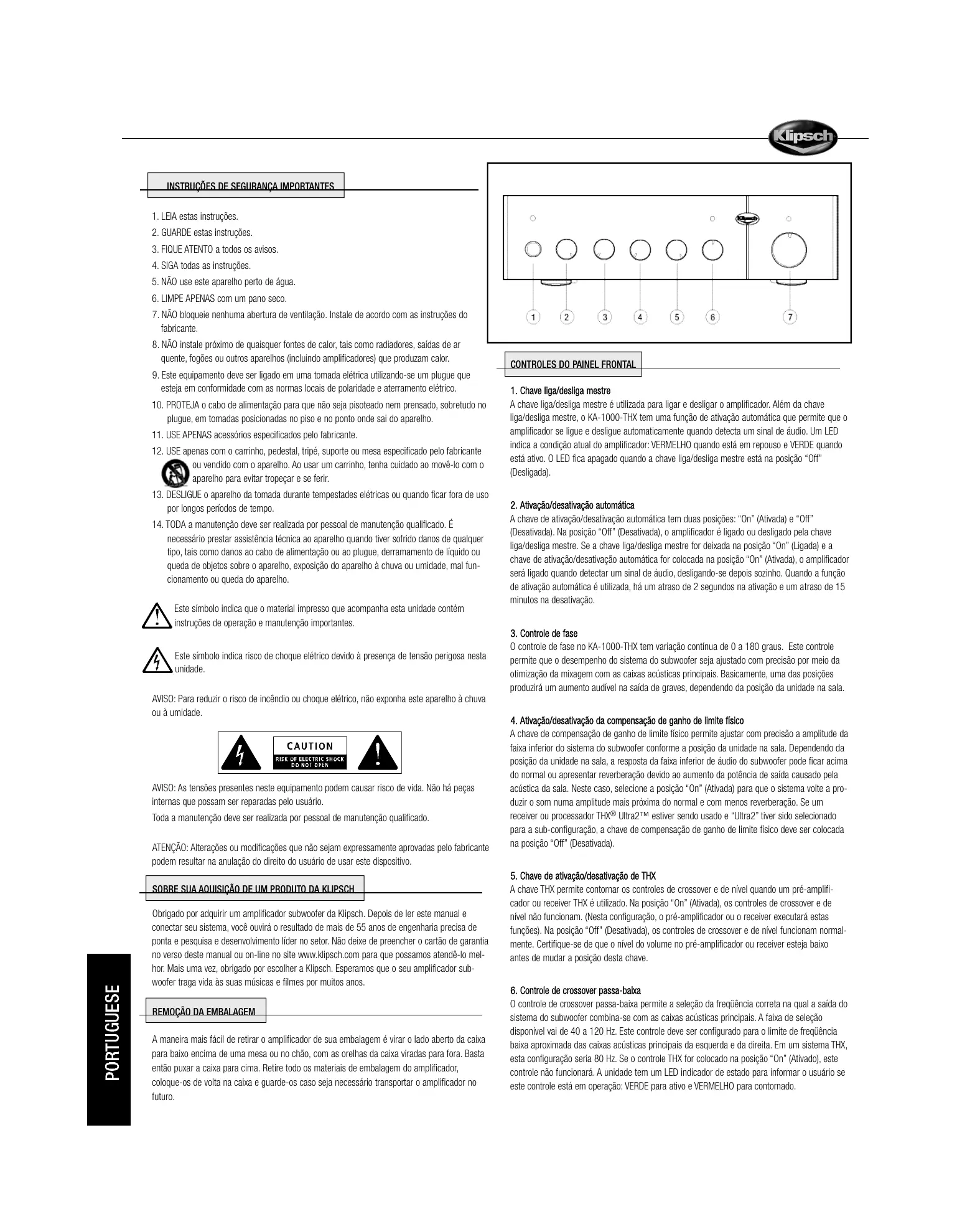 Encontre gratuitamente o manual do aparelho KA-1000-THX KLIPSCH em formato PDF.
