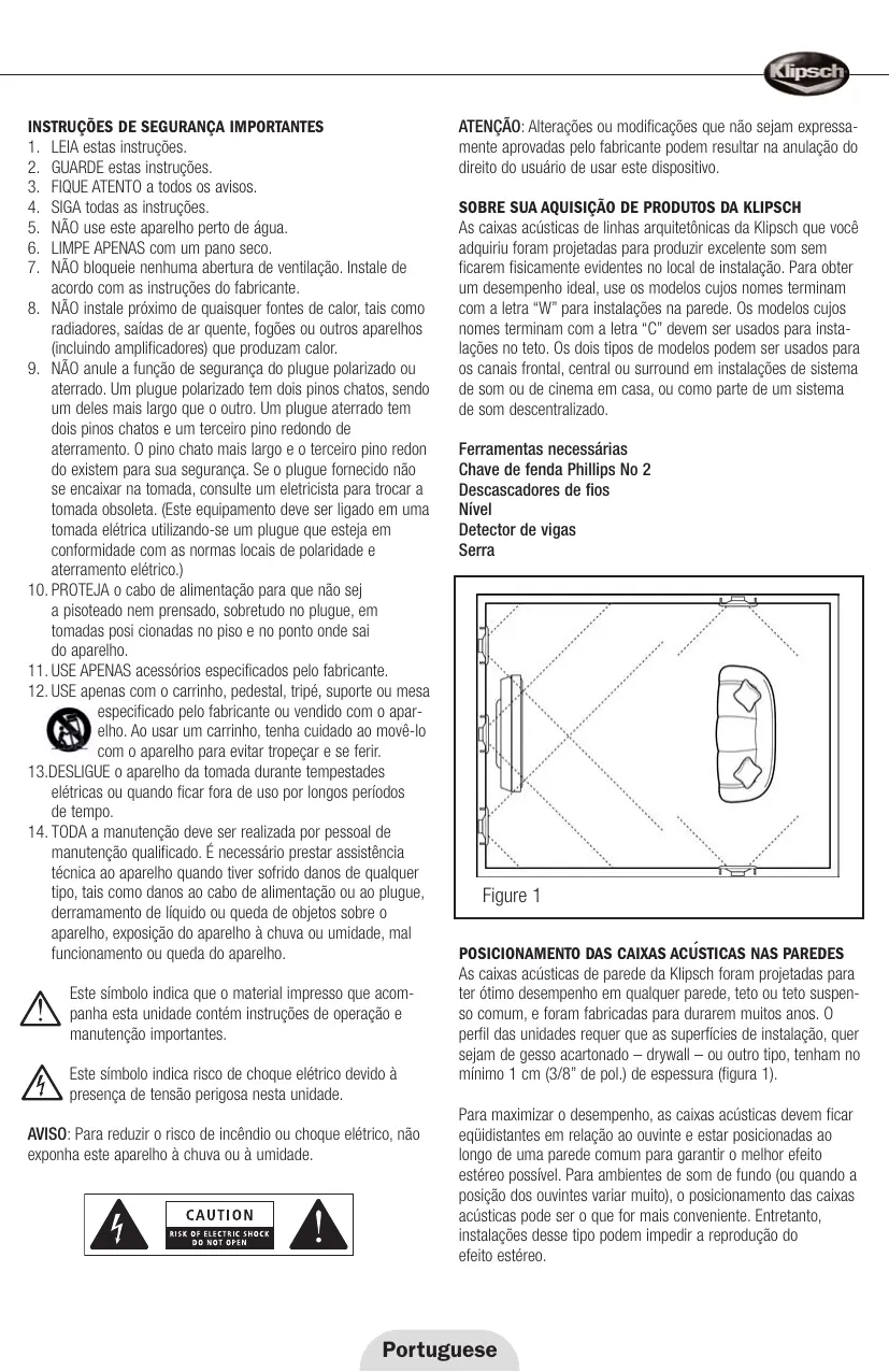 As caixas acústicas de linhas arquitetônicas da Klipsch que você adquiriu foram projetadas para produzir excellente som sem ficarem fisicamente evidentes no local de instalação. Para obter um desempenho ideal, use os modelos@cujos nomes terminam com a letra "W" para instalações na parede. Os modelos@cujos nomes terminam com a letra "C" devem ser usados para instalações no teto. Os Doyleiros de modelos podem ser usados para os canais frontal, central ou surround em instalações de sistemas de som ou de cinema em casa, ou como parte de umsystema de som descentralizzato.