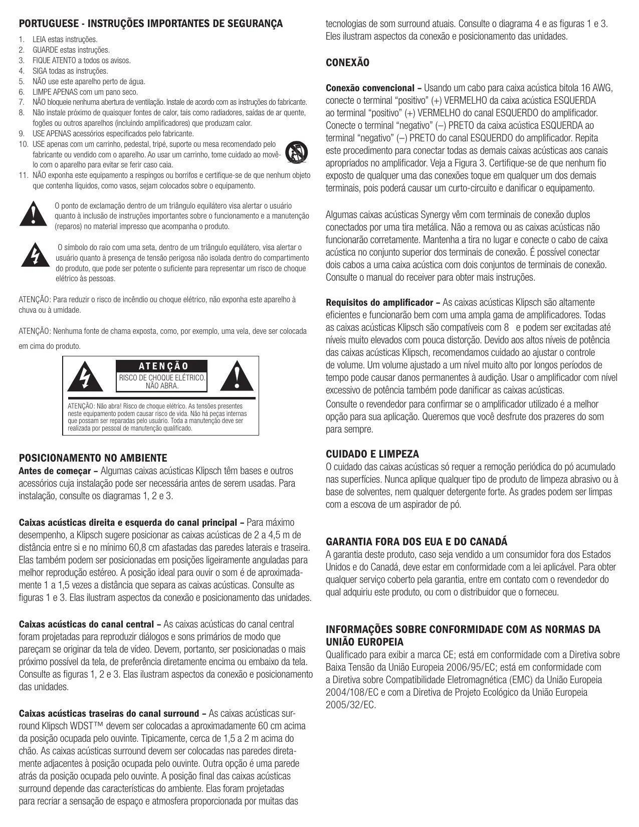 Requisitos do amplífador - As caixas acústicas Klipsch são alimentamente eficientes e Functionarão bem com uma ampla gama de amplificadores. Todas as caixas acústicas Klipsch são compatíveis com 8 e podem ser excitadas até nãois muito elevados com pouca distortion. Devido aos altos nãois de potência das caixas acústicas Klipsch, recomendamos cuidado ao fazer o controle de volume. Um volume ajustado a um não muito alto por longos periodos de tempo pode causar danos permanentes à audição. Usar o amplífador com não excessivo de potência也是非常 pode danIFICAR as caixas acústicas.