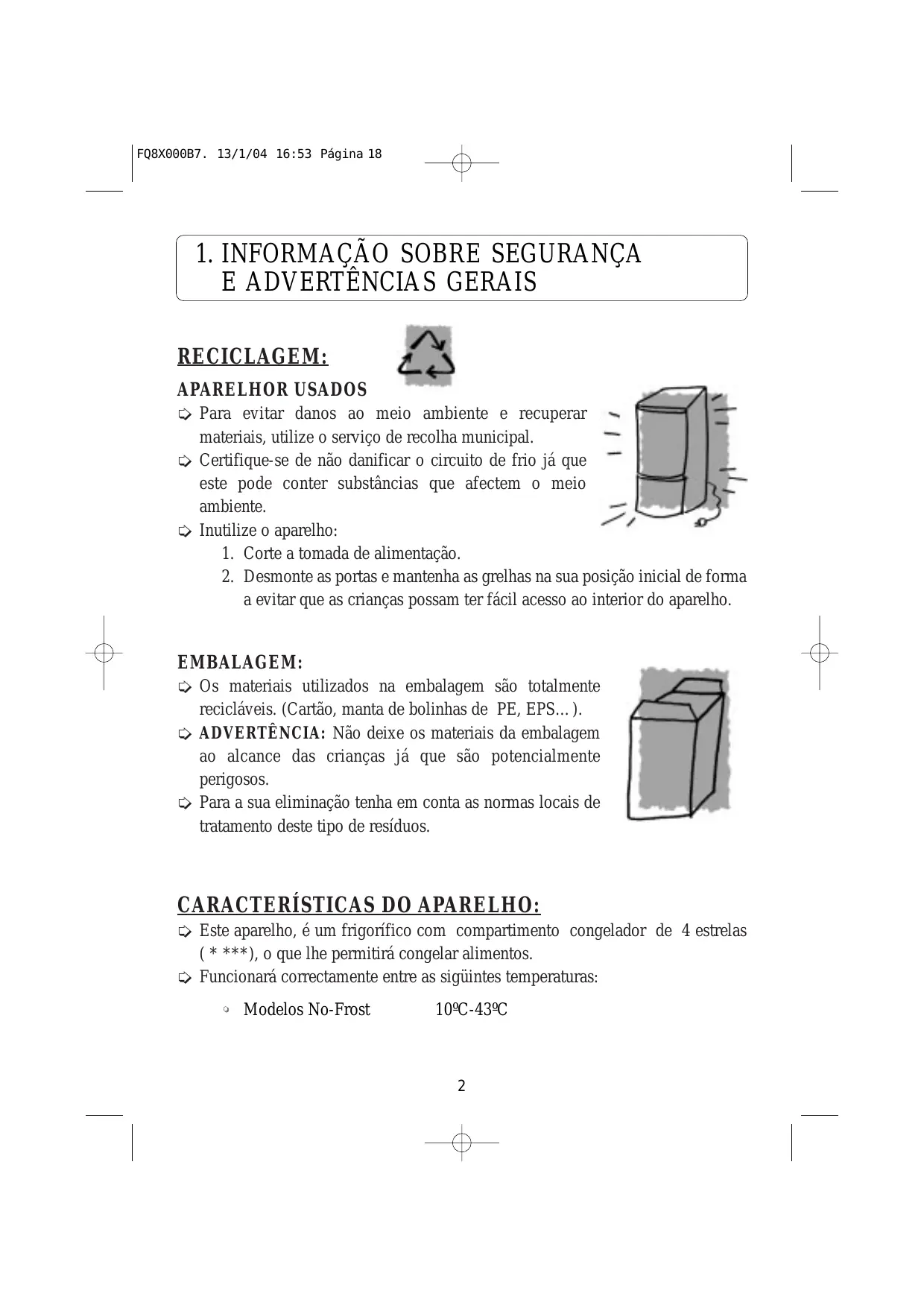 a evitar que as crianças possam ter fácil acesso ao interior do aparelho. EMBALAGEM: Os materiais utilizados na embalagem são totalmente recicláveis. (Cartão, manta de bolinhas de PE, EPS…). ADVERTÊNCIA: Não deixe os materiais da embalagem ao alcance das crianças já que são potencialmente perigosos. Para a sua eliminação tenha em conta as normas locais de tratamento deste tipo de resíduos. CARACTERÍSTICAS DO APARELHO: Este aparelho, é um frigorífico com compartimento congelador de 4 estrelas ( * ***), o que lhe permitirá congelar alimentos. Funcionará correctamente entre as sigüintes temperaturas: