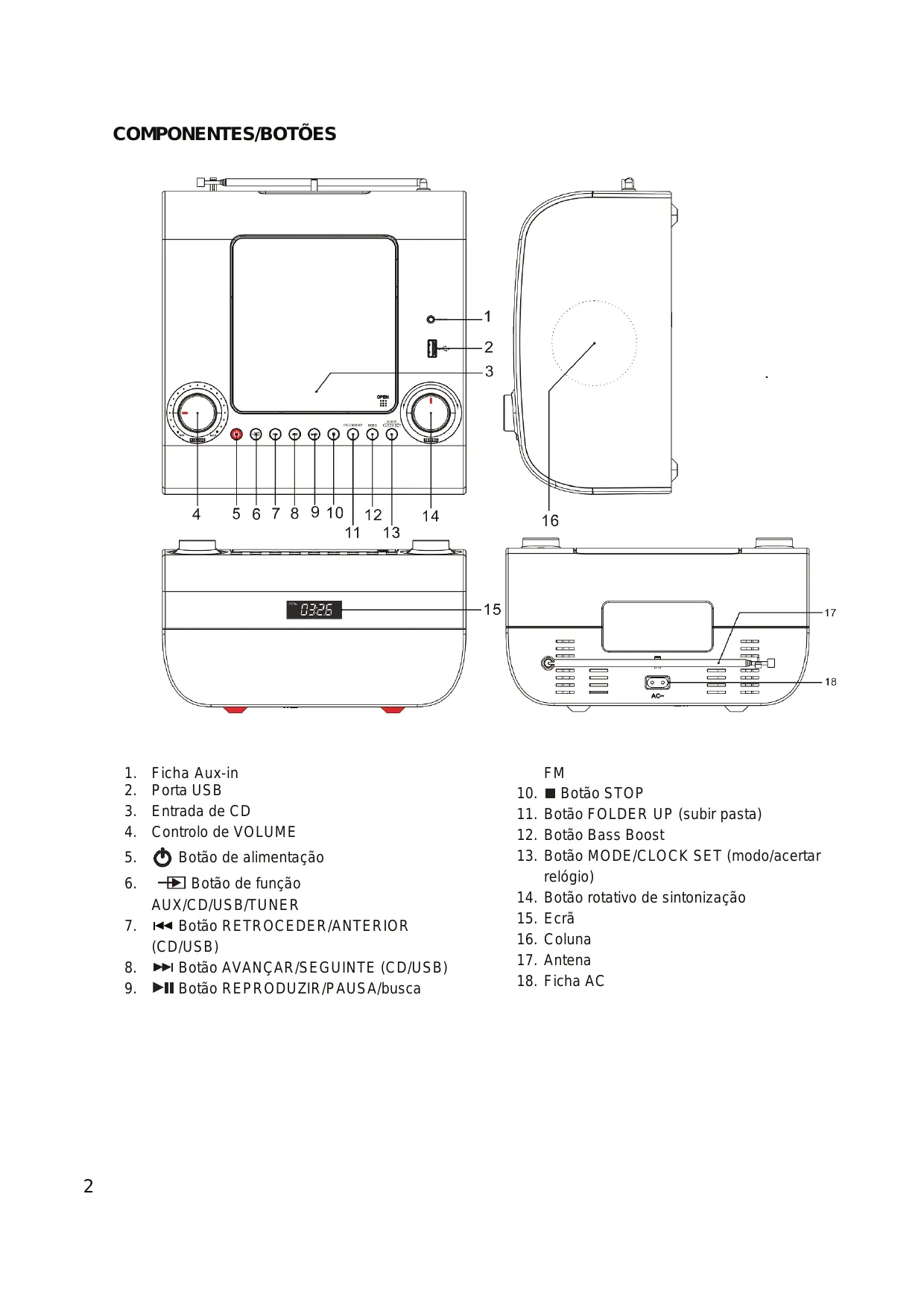 Atenção: o aparelho apenas é compatível com unidades USB de formato FAT32 com menos de 32 GB. AUX-IN Ligue uma extremidade do cabo de áudio de 3.5 mm (incluso) à ficha Aux-in (1) no topo do aparelho e a outra extremidade a uma entrada Line-out ou de auscultadores de uma fonte de áudio externa para reproduzir o som através das colunas desse aparelho. Durante a utilização da funcionalidade Aux-in o leitor de CD não estará disponível. BASS BOOST Prima o botão Bass Boost (12) uma vez para ativar a funcionalidade (DBBS será exibido no ecrã) e desfrutar de um som com baixos mais poderosos. Nota: o aparelho entrará no modo de suspensão se não for reproduzido som durante cerca de 30 minutos nos modos CD, USB ou AUX de modo a poupar energia. O aparelho pode ser ligado de novo com o botão de função AUX/CD/USB/TUNER. ESPECIFICAÇÕES Alimentação: AC 230 V ~ 50 Hz Consumo de energia: 13 W Cobertura de frequência de rádio: FM 87.5 – 108 MHz Não coloque os aparelhos elétricos e eletrónicos no lixo normal.