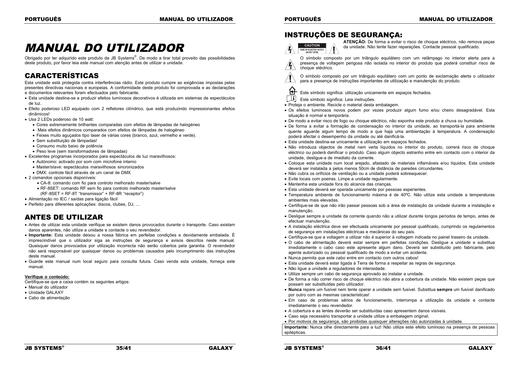 Obrigado por ter adquirido este produit da JB Systems. De modo a tirar total proveito das possibilidades deste produits, por favor leia este manual com atenção antes de utilizear a unidade.