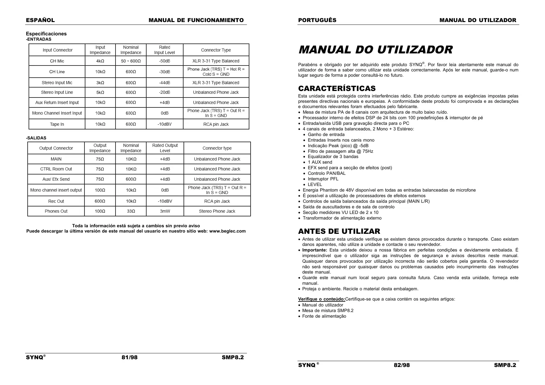 SMP 8.2 - Mesa de mixagem de áudio SYNQ AUDIO RESEARCH - Manual de utilização gratuito