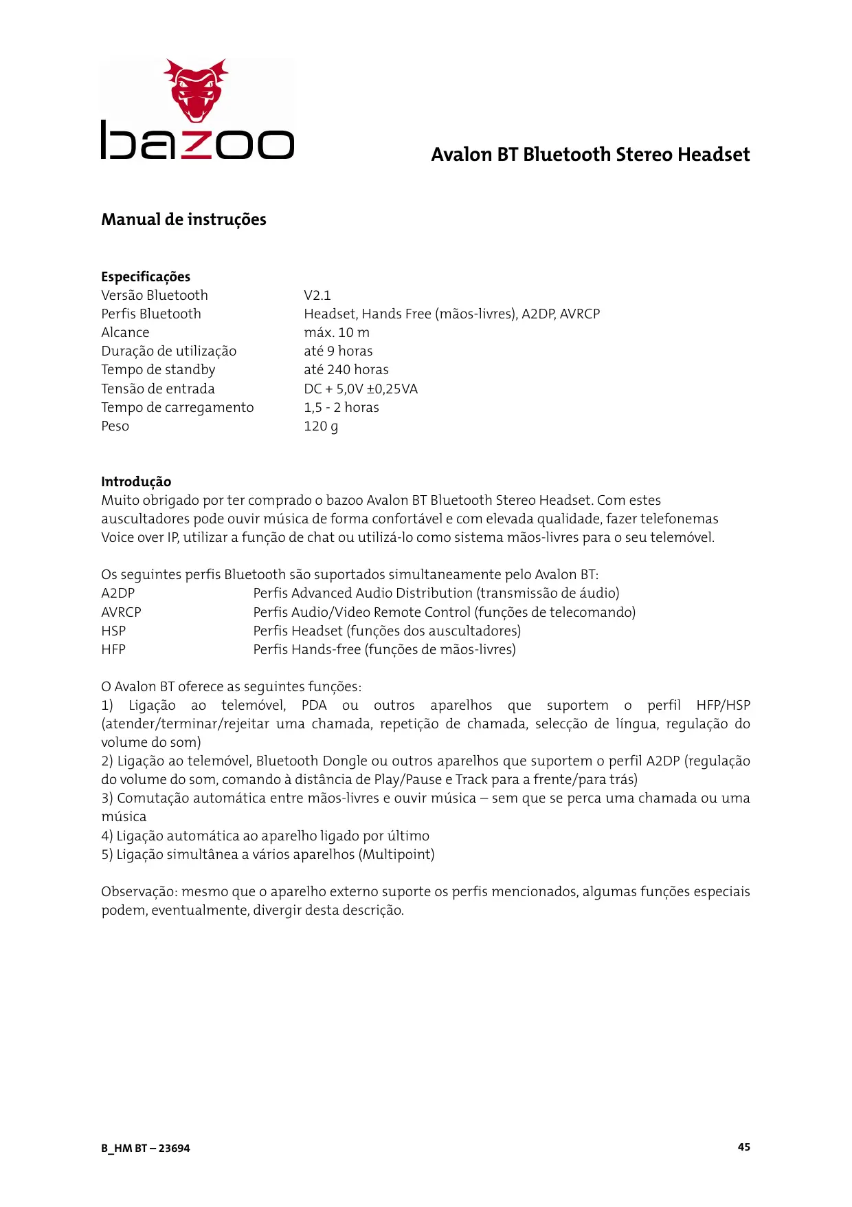 Muito obrigado por ter comprado o bazoo Avalon BT Bluetooth Stereo Headset. Com estas auscultadores pode ouvir música de forma comfortavel e com elevada qualidade, fazer Telefonemas Voice over IP, utilizear a funcao de chat ou utilizeso comoSYSTEMA maois-livres para o seu telemóvel.