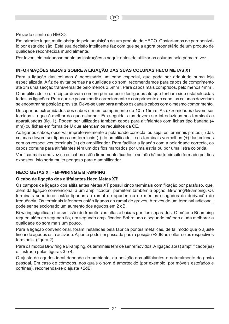 Prezado cliente da HECO, Em primeiro lugar, muito obrigado pela aquisição de um produto da HECO. Gostaríamos de parabenizálo por esta decisão. Esta sua decisão inteligente faz com que seja agora proprietário de um produto de qualidade reconhecida mundialmente. Por favor, leia cuidadosamente as instruções a seguir antes de utilizar as colunas pela primeira vez. INFORMAÇÕES GERAIS SOBRE A LIGAÇÃO DAS SUAS COLUNAS HECO METAS XT Para a ligação das colunas é necessário um cabo especial, que pode ser adquirido numa loja especializada. A fiz de evitar perdas na qualidade do som, recomendamos para cabos de comprimento até 3m uma secção transversal de pelo menos 2,5mm². Para cabos mais compridos, pelo menos 4mm². O amplificador e o receptor devem sempre permanecer desligados até que tenham sido estabelecidas todas as ligações. Para que se possa medir correctamente o comprimento do cabo, as colunas deveriam se encontrar na posição prevista. Deve-se usar para ambos os canais cabos com o mesmo comprimento. Decapar as extremidades dos cabos em um comprimento de 10 a 15mm. As extremidades devem ser torcidas - o que é melhor do que estanhar. Em seguida, elas devem ser introduzidas nos terminais e aparafusadas (fig. 1). Podem ser utilizados também cabos para altifalantes com fichas tipo banana (4 mm) ou fichas em forma de U que atendam os requisitos da CE. Ao ligar os cabos, observar impreterivelmente a polaridade correcta, ou seja, os terminais pretos (-) das colunas devem ser ligados aos terminais (-) do amplificador e os terminais vermelhos (+) das colunas com os respectivos terminais (+) do amplificador. Para facilitar a ligação com a polaridade correcta, os cabos comuns para altifalantes têm um dos fios marcados por uma estria ou por uma listra colorida. Verificar mais uma vez se os cabos estão firmemente fixados e se não há curto-circuito formado por fios expostos. Isto seria muito perigoso para o amplificador. HECO METAS XT - BI-WIRING E BI-AMPING O cabo de ligação dos altifalantes Heco Metas XT: Os campos de ligação dos altifalantes Metas XT possui cinco terminais com fixação por parafuso, que, além da ligação convencional a um amplificador, permitem também a opção Bi-wiring/Bi-amping. Os terminais superiores estão ligados ao ramal de agudos ou de médios e agudos da derivação de frequência. Os terminais inferiores estão ligados ao ramal de graves. Através de um terminal adicional, pode ser seleccionado um aumento dos agudos em 2 dB. Bi-wiring significa a transmissão de frequências altas e baixas por fios separados. O método Bi-amping requer, além do segundo fio, um segundo amplificador. Sobretudo o segundo método ajuda melhorar a qualidade do som mais um pouco. Para a ligação convencional, foram instaladas pela fábrica pontes metálicas, de tal modo que o ajuste linear de agudos está activado. A ponte pode ser passada para a posição +2dB ao soltar-se os respectivos terminais. (figura 2) Para os modos Bi-wiring e Bi-amping, os terminais têm de ser removidos. A ligação ao(s) ampflificador(es) é ilustrada pelas figuras 3 e 4. O ajuste de agudos ideal depende do ambiente, da posição dos altifalantes e naturalmente do gosto pessoal. Em caso de cómodos, nos quais o som é amortecido (por exemplo, por móveis estofados e cortinas), recomenda-se o ajuste +2dB.