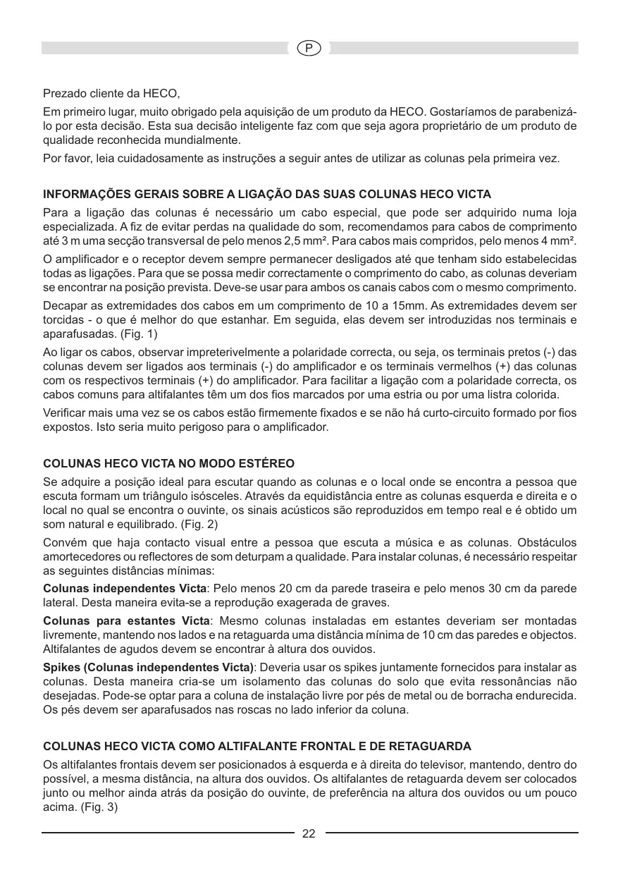 Prezado cliente da HECO, Em primeiro lugar, muito obrigado pela aquisição de um produto da HECO. Gostaríamos de parabenizálo por esta decisão. Esta sua decisão inteligente faz com que seja agora proprietário de um produto de qualidade reconhecida mundialmente. Por favor, leia cuidadosamente as instruções a seguir antes de utilizar as colunas pela primeira vez. INFORMAÇÕES GERAIS SOBRE A LIGAÇÃO DAS SUAS COLUNAS HECO VICTA Para a ligação das colunas é necessário um cabo especial, que pode ser adquirido numa loja especializada. A fiz de evitar perdas na qualidade do som, recomendamos para cabos de comprimento até 3 m uma secção transversal de pelo menos 2,5 mm². Para cabos mais compridos, pelo menos 4 mm². O amplificador e o receptor devem sempre permanecer desligados até que tenham sido estabelecidas todas as ligações. Para que se possa medir correctamente o comprimento do cabo, as colunas deveriam se encontrar na posição prevista. Deve-se usar para ambos os canais cabos com o mesmo comprimento. Decapar as extremidades dos cabos em um comprimento de 10 a 15mm. As extremidades devem ser torcidas - o que é melhor do que estanhar. Em seguida, elas devem ser introduzidas nos terminais e aparafusadas. (Fig. 1) Ao ligar os cabos, observar impreterivelmente a polaridade correcta, ou seja, os terminais pretos (-) das colunas devem ser ligados aos terminais (-) do amplificador e os terminais vermelhos (+) das colunas com os respectivos terminais (+) do amplificador. Para facilitar a ligação com a polaridade correcta, os cabos comuns para altifalantes têm um dos fios marcados por uma estria ou por uma listra colorida. Verificar mais uma vez se os cabos estão firmemente fixados e se não há curto-circuito formado por fios expostos. Isto seria muito perigoso para o amplificador. COLUNAS HECO VICTA NO MODO ESTÉREO Se adquire a posição ideal para escutar quando as colunas e o local onde se encontra a pessoa que escuta formam um triângulo isósceles. Através da equidistância entre as colunas esquerda e direita e o local no qual se encontra o ouvinte, os sinais acústicos são reproduzidos em tempo real e é obtido um som natural e equilibrado. (Fig. 2) Convém que haja contacto visual entre a pessoa que escuta a música e as colunas. Obstáculos amortecedores ou reflectores de som deturpam a qualidade. Para instalar colunas, é necessário respeitar as seguintes distâncias mínimas: Colunas independentes Victa: Pelo menos 20 cm da parede traseira e pelo menos 30 cm da parede lateral. Desta maneira evita-se a reprodução exagerada de graves. Colunas para estantes Victa: Mesmo colunas instaladas em estantes deveriam ser montadas livremente, mantendo nos lados e na retaguarda uma distância mínima de 10 cm das paredes e objectos. Altifalantes de agudos devem se encontrar à altura dos ouvidos. Spikes (Colunas independentes Victa): Deveria usar os spikes juntamente fornecidos para instalar as colunas. Desta maneira cria-se um isolamento das colunas do solo que evita ressonâncias não desejadas. Pode-se optar para a coluna de instalação livre por pés de metal ou de borracha endurecida. Os pés devem ser aparafusados nas roscas no lado inferior da coluna. COLUNAS HECO VICTA COMO ALTIFALANTE FRONTAL E DE RETAGUARDA Os altifalantes frontais devem ser posicionados à esquerda e à direita do televisor, mantendo, dentro do possível, a mesma distância, na altura dos ouvidos. Os altifalantes de retaguarda devem ser colocados junto ou melhor ainda atrás da posição do ouvinte, de preferência na altura dos ouvidos ou um pouco acima. (Fig. 3)
