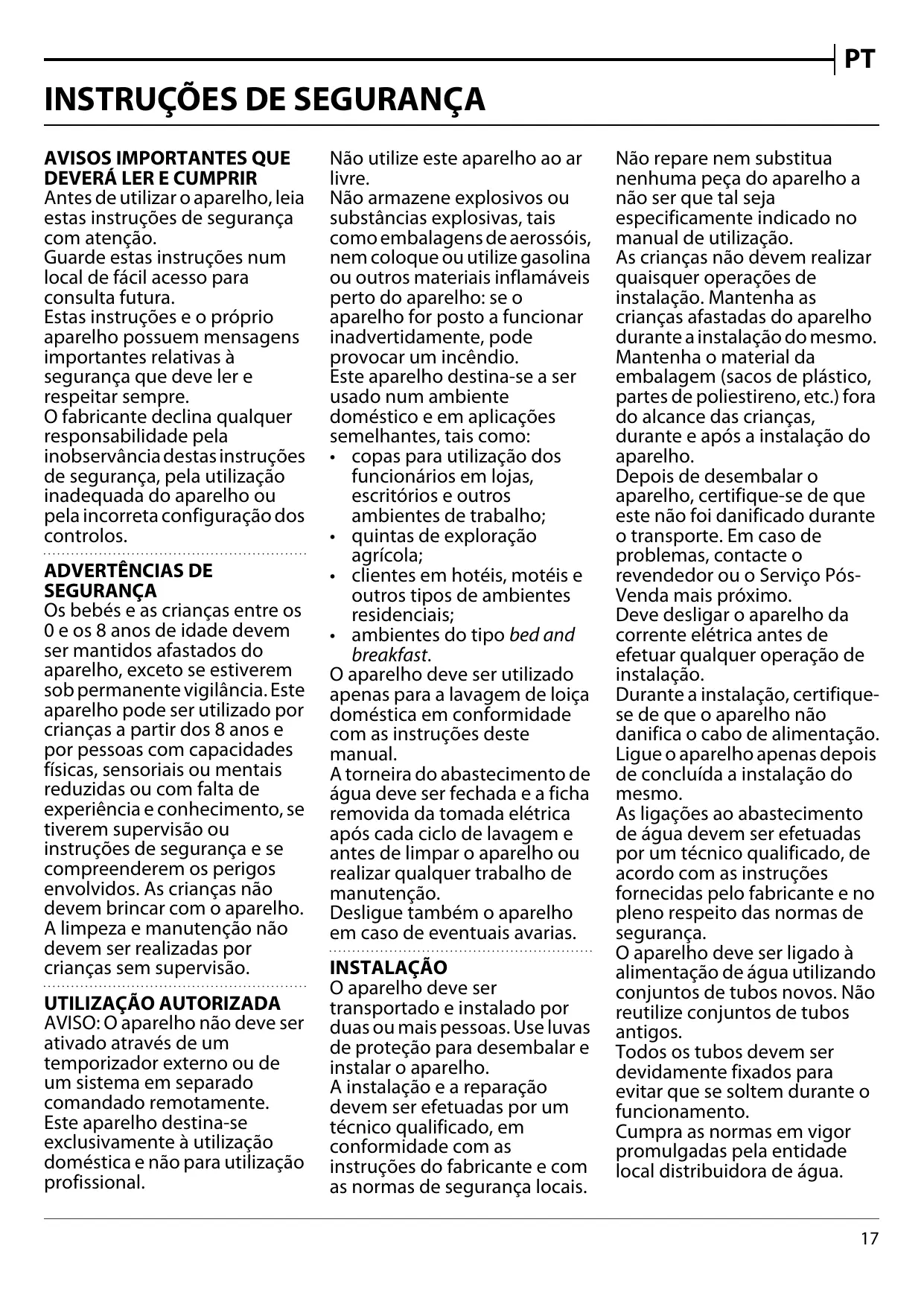- ambientes do tipo bed and breakfast. O aparelho deve ser utilizado apenas para a lavagem de loiça doméstica em conformidade com as instruções deste manual. A torneira do abastecimento de água deve ser fechada e a ficha removida da tomada elétrica após cada ciclo de lavagem e antes de limpar o aparelho ou realizar qualquer trabalho de manutenção. Desligue também o aparelho em caso de eventuais avarias. INSTALAÇÃO O aparelho deve ser transportado e instalado por duas ou mais pessoas. Use luvas de proteção para desembalar e instalar o aparelho. A instalação e a reparação devem ser efetuadas por um técnico qualificado, em conformidade com as instruções do fabricante e com as normas de segurança locais. Não repare nem substitua nenhuma peça do aparelho a não ser que tal seja especificamente indicado no manual de utilização. As crianças não devem realizar quaisquer operações de instalação. Mantenha as crianças afastadas do aparelho durante a instalação do mesmo. Mantenha o material da embalagem (sacos de plástico, partes de poliestireno, etc.) fora do alcance das crianças, durante e após a instalação do aparelho. Depois de desembalar o aparelho, certifique-se de que este não foi danificado durante o transporte. Em caso de problemas, contacte o revendedor ou o Serviço PósVenda mais próximo. Deve desligar o aparelho da corrente elétrica antes de efetuar qualquer operação de instalação. Durante a instalação, certifiquese de que o aparelho não danifica o cabo de alimentação. Ligue o aparelho apenas depois de concluída a instalação do mesmo. As ligações ao abastecimento de água devem ser efetuadas por um técnico qualificado, de acordo com as instruções fornecidas pelo fabricante e no pleno respeito das normas de segurança. O aparelho deve ser ligado à alimentação de água utilizando conjuntos de tubos novos. Não reutilize conjuntos de tubos antigos. Todos os tubos devem ser devidamente fixados para evitar que se soltem durante o funcionamento. Cumpra as normas em vigor promulgadas pela entidade local distribuidora de água.