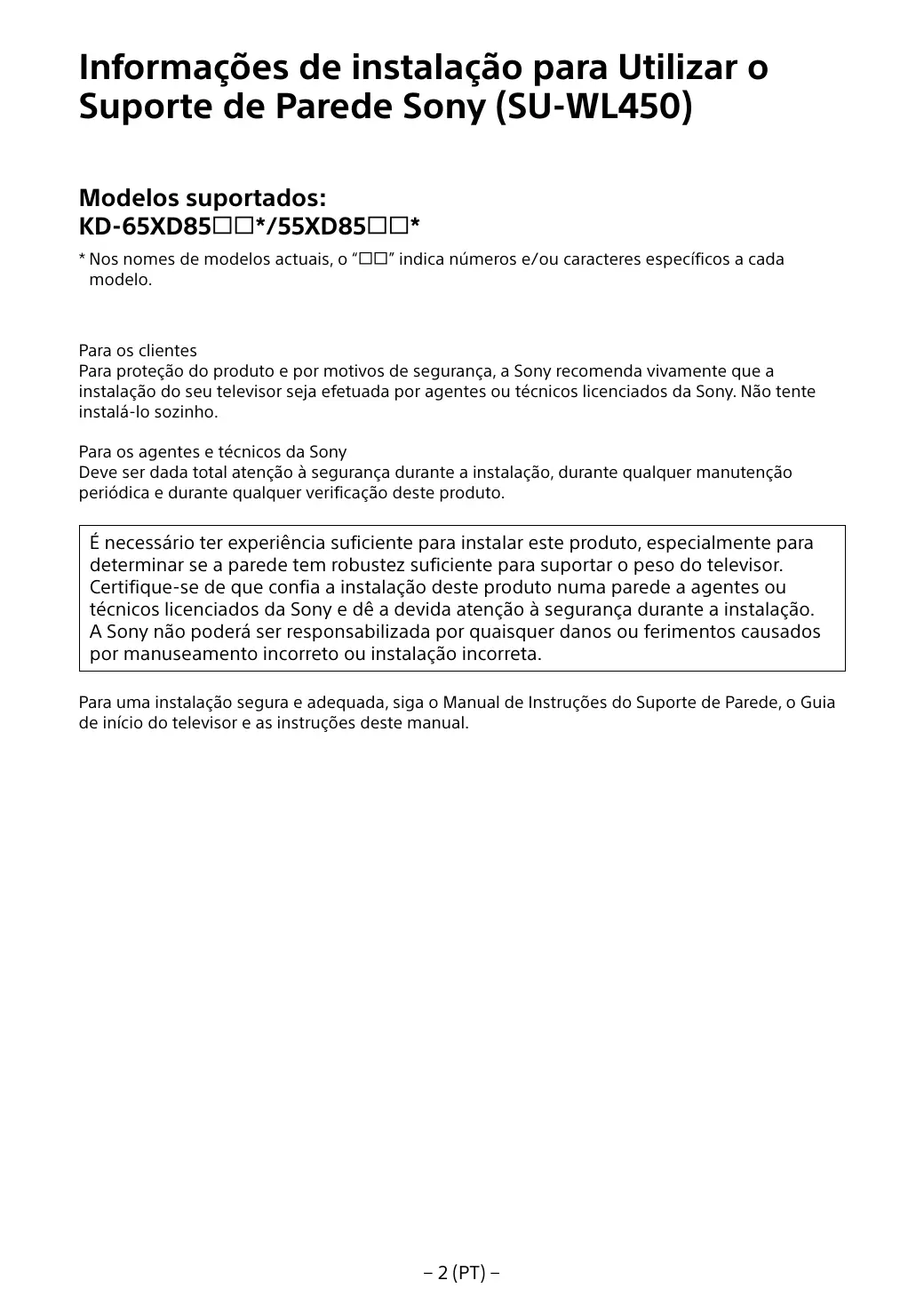 A l’attention des installateurs et revendeurs Sony Soyez particulièrement attentif à la sécurité pendant l’installation, l’entretien périodique et l’examen du produit.