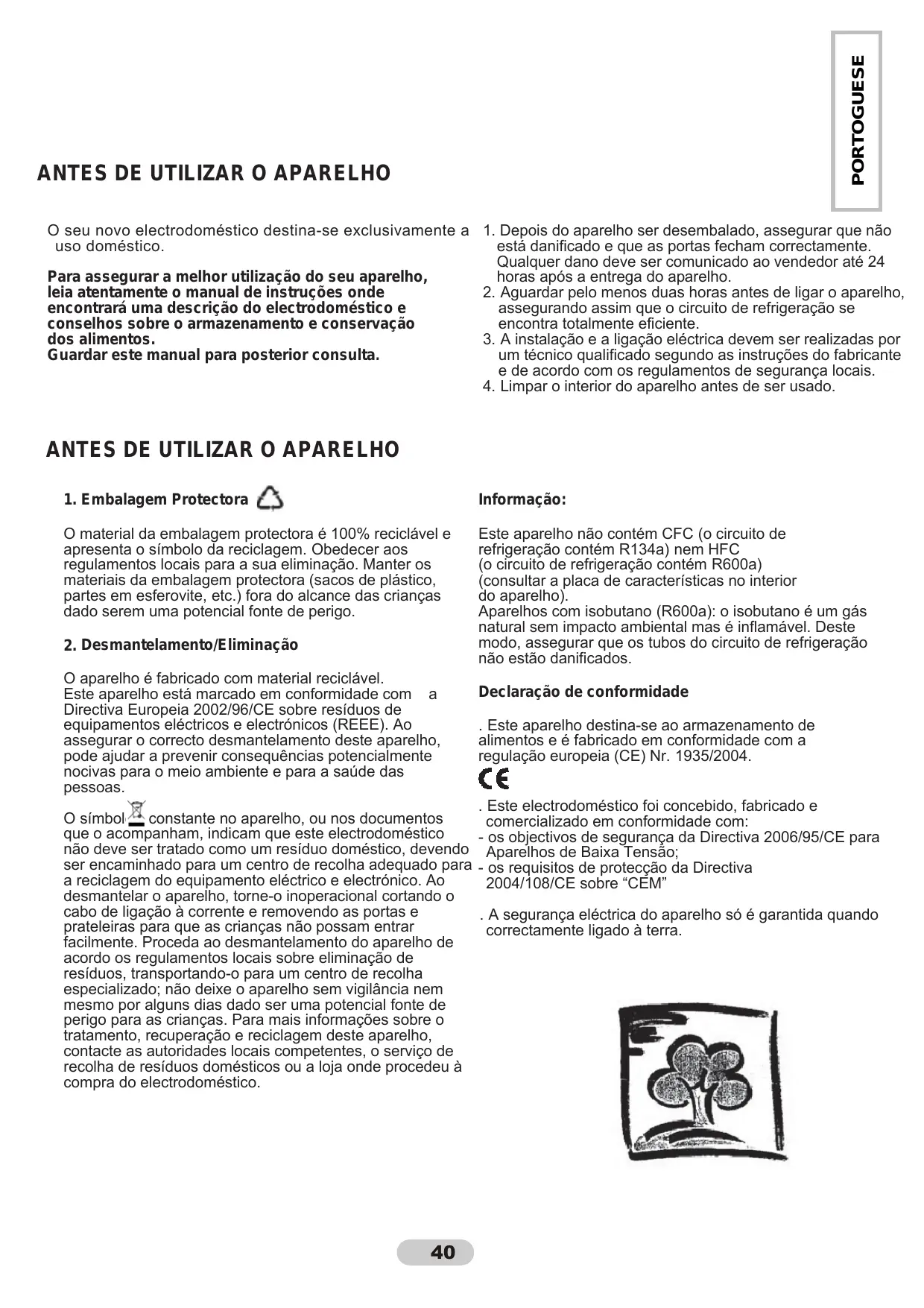 PRECAUÇAÑO: No final da vida útil do aparelho, este terá de ser eliminado em conformidade com a directiva W.E.E.E (ver abaixo). O seu electrodométrico contém refrigerante R600a e gás inflamível na espuma de isolamento.