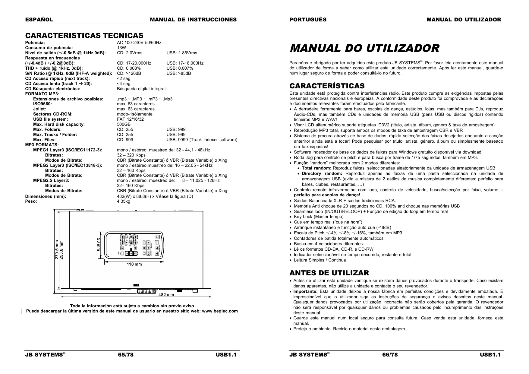 Parabéns e obrigado por ter adquirido este produto JB SYSTEMS . Por favor leia atentamente este manual do utilizador de forma a saber como utilizar esta unidade correctamente. Após ler este manual, guarde-o num lugar seguro de forma a poder consultá-lo no futuro. CD: 17-20.000Hz USB: 17-16.000Hz CD: 0.008% USB: 0.007% CD: >126dB USB: >85dB <2 seg <4 seg Búsqueda digital integral. CARACTERÍSTICAS .mp3 ~ .MP3 ~ .mP3 ~ .Mp3 max. 63 caracteres max. 63 caracteres modo-1sólamente FAT 12/16/32 500GB CD: 255 USB: 999 CD: 255 USB: 999 CD: 999 USB: 9999 (Track Indexer software) mono / estéreo, muestreo de: 32 - 44,1 - 48kHz 32 – 320 Kbps CBR (Bitrate Constante) ó VBR (Bitrate Variable) o Xing mono / estéreo,muestreo de: 16 – 22,05 - 24kHz 32 – 160 Kbps CBR (Bitrate Constante) ó VBR (Bitrate Variable) o Xing mono / estéreo, muestreo de: 8 – 11,025 - 12kHz 32– 160 Kbps CBR (Bitrate Constante) ó VBR (Bitrate Variable) o Xing 482(W) x 88.8(H) x Véase la figura (D) 4,35kg Esta unidade está protegida contra interferências rádio. Este produto cumpre as exigências impostas pelas presentes directivas nacionais e europeias. A conformidade deste produto foi comprovada e as declarações e documentos relevantes foram efectuados pelo fabricante. A derradeira ferramenta para bares, escolas de dança, estúdios, lojas, mas também para DJs, reproduz Áudio-CDs, mas também CDs e unidades de memória USB (pens USB ou discos rígidos) contendo ficheiros MP3 e WAV! Visor LCD alfanumérico suporta etiquetas ID3V2 (titulo, artista, álbum, género & taxa de amostragem) Reprodução MP3 total, suporta ambos os modos de taxa de amostragem CBR e VBR Sistema de procura através de base de dados: rápida selecção das faixas desejadas enquanto a canção anteriror ainda está a tocar! Pode pesquisar por título, artista, género, álbum ou simplesmente baseado em faixas/pastas! Software indexador de base de dados de faixas para Windows gratuito disponível via download! Roda Jog para controlo de pitch e para busca por frame de 1/75 segundos, também em MP3. Função “random” melhorada com 2 modos diferentes: Total random: Reproduz faixas, seleccionadas aleatoriamente da unidade de armazenagem USB Directory random: Reproduz apenas as faixas de uma pasta seleccionada na unidade de armazenagem USB (evita a mistura de 2 estilos de musica completamente diferentes: perfeito para bares, clubes, restaurantes, …) Controlo remoto infravermelho com loop, controlo de velocidade, busca/selecção por faixa, volume...: perfeito para escolas de dança! Saídas Balanceada XLR + saídas tradicionais RCA. Memória Anti choque de 20 segundos no CD, 100% anti choque nas memórias USB Seamless loop (IN/OUT/RELOOP) + Função de edição do loop em tempo real Key Lock (Master tempo) Cue em tempo real (“cue na hora”) Arranque instantâneo e funcção auto cue (-48dB) Escala de Pitch +/-4% +/-8% +/-16%, também em MP3 Contadores de batida totalmente automáticos Busca em 4 velocidades diferentes Lê os formatos CD-DA, CD-R, e CD-RW Indicador seleccionável de tempo decorrido, restante e total Leitura Simples / Continua