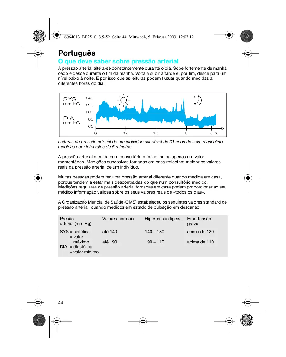 6064013_BP2510_S.5-52 Seite 44 Mittwoch, 5. Februar 2003 12:07 12 Português O que deve saber sobre pressão arterial A pressão arterial altera-se constantemente durante o dia. Sobe fortemente de manhã cedo e desce durante o fim da manhã. Volta a subir à tarde e, por fim, desce para um nível baixo à noite. É por isso que as leituras podem flutuar quando medidas a diferentes horas do dia. SYS