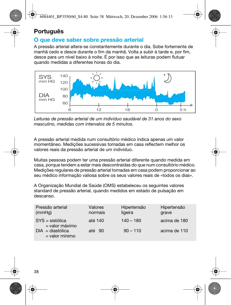 6084401_BP3550/60_S4-80 Seite 38 Mittwoch, 20. Dezember 2006 1:56 13 Português O que deve saber sobre pressão arterial A pressão arterial altera-se constantemente durante o dia. Sobe fortemente de manhã cedo e desce durante o fim da manhã. Volta a subir à tarde e, por fim, desce para um nível baixo à noite. É por isso que as leituras podem flutuar quando medidas a diferentes horas do dia. SYS