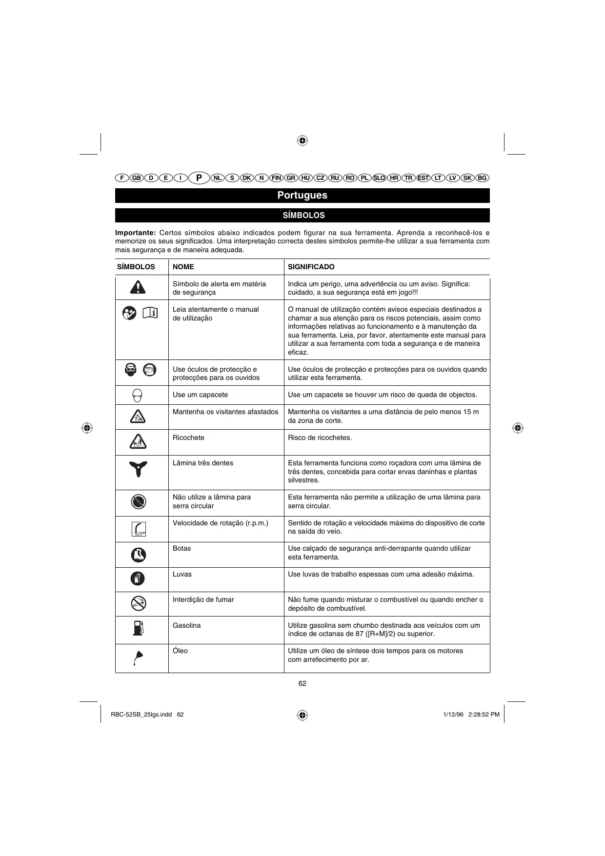 Portugues SÍMBOLOS Importante: Certos símbolos abaixo indicados podem figurar na sua ferramenta. Aprenda a reconhecê-los e memorize os seus significados. Uma interpretação correcta destes símbolos permite-lhe utilizar a sua ferramenta com mais segurança e de maneira adequada. SÍMBOLOS NOME SIGNIFICADO Símbolo de alerta em matéria de segurança Indica um perigo, uma advertência ou um aviso. Significa: cuidado, a sua segurança está em jogo!!! Leia atentamente o manual de utilização O manual de utilização contém avisos especiais destinados a chamar a sua atenção para os riscos potenciais, assim como informações relativas ao funcionamento e à manutenção da sua ferramenta. Leia, por favor, atentamente este manual para utilizar a sua ferramenta com toda a segurança e de maneira eficaz. Use óculos de protecção e protecções para os ouvidos Use óculos de protecção e protecções para os ouvidos quando utilizar esta ferramenta. Use um capacete Use um capacete se houver um risco de queda de objectos. Mantenha os visitantes afastados Mantenha os visitantes a uma distância de pelo menos 15 m da zona de corte. Ricochete Risco de ricochetes. Lâmina três dentes Esta ferramenta funciona como roçadora com uma lâmina de três dentes, concebida para cortar ervas daninhas e plantas silvestres. Não utilize a lâmina para serra circular Esta ferramenta não permite a utilização de uma lâmina para serra circular. Velocidade de rotação (r.p.m.) Sentido de rotação e velocidade máxima do dispositivo de corte na saída do veio. Botas Use calçado de segurança anti-derrapante quando utilizar esta ferramenta. Luvas Use luvas de trabalho espessas com uma adesão máxima. Interdição de fumar Não fume quando misturar o combustível ou quando encher o depósito de combustível. Gasolina Utilize gasolina sem chumbo destinada aos veículos com um índice de octanas de 87 ([R+M]/2) ou superior. Óleo Utilize um óleo de síntese dois tempos para os motores com arrefecimento por ar.