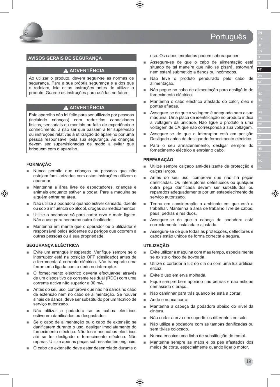 Desactivar e desligar do fornecimento eléctrico antes de: – manutenção – deixar a podadora sem vigilância – limpar a sua podadora – mudar acessórios – comprovar se há danos depois de bater num objecto – comprovar se há danos caso a podadora comece a vibrar de um modo anormal – realizar operações de manutenção Use óculos de protecção.