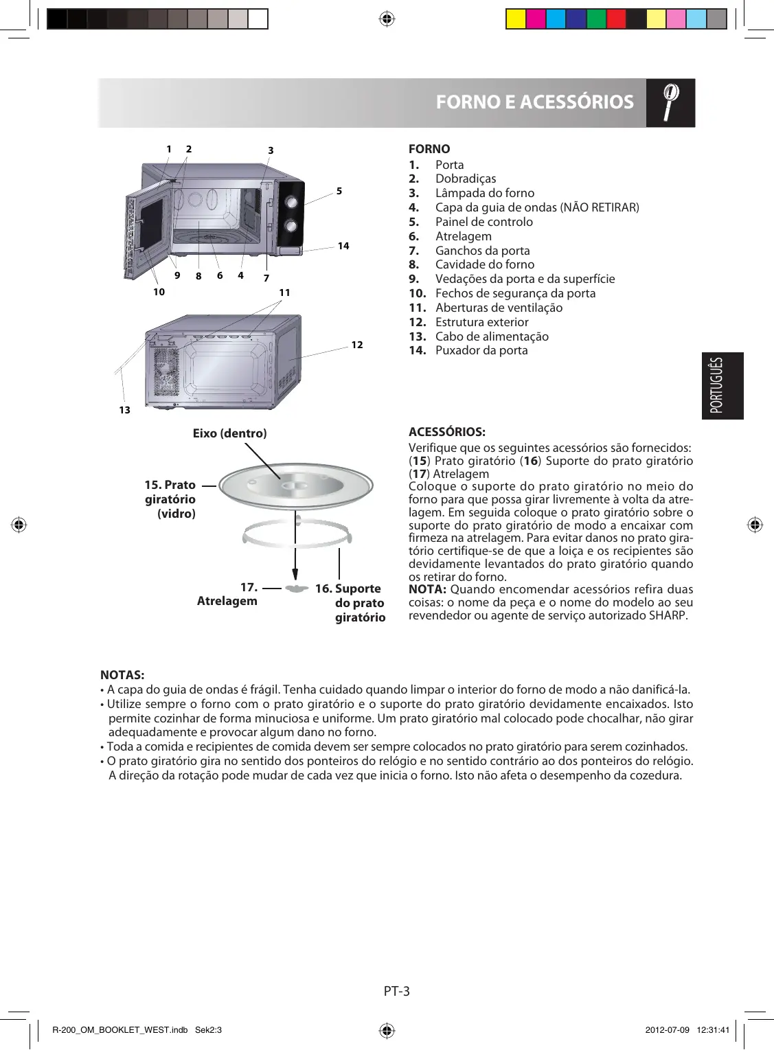 - O prato giratório gira no sentido dos ponteiros do relógio e no sentido contrário ao dos ponteiros do relógio. A direção da rotação pode mudar de cada vez que inicia o forno. Isto não afeta o desempenho da cozedura. PT-3 R-200_OM_BOOKLET_WEST.indb Sek2:3 2012-07-09 12:31:41