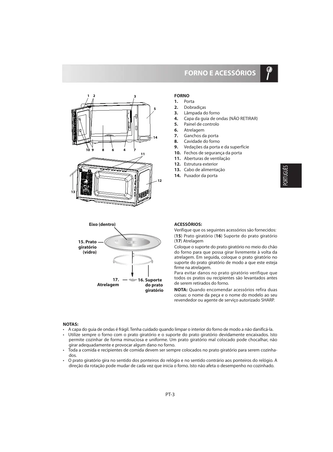 - A capa do guia de ondas é fragil. Tenha dificuldado quando limpar o interior doorno de modo a não danificá-la.