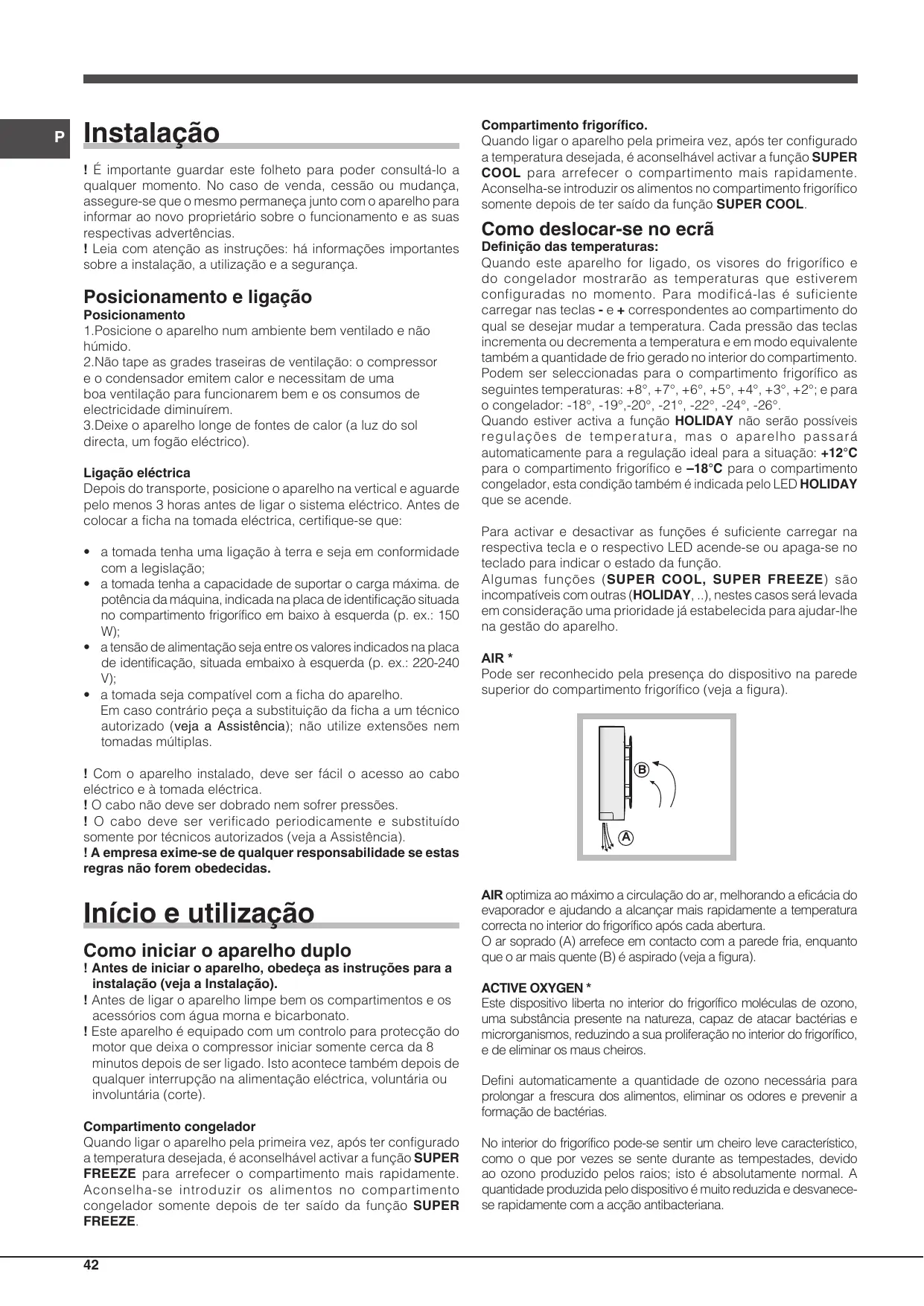 Si l’appareil est en service, les afficheurs du compartiment réfrigérateur et du compartiment congélateur visualiseront les températures sélectionnées à ce moment-là. Pour les modifier, appuyer sur les touches - et + correspondant au compartiment à l’intérieur duquel la température doit être modifiée. Chaque pression sur les touches fait augmenter ou diminuer la température et, de façon équivalente, la quantité de froid généré à l’intérieur du compartiment. Les températures du compartiment réfrigérateur sélectionnables sont: +8°, +7°, +6°, +5°, +4°, +3°, +2°. Celles du congélateur sont : –18°, -19°,-20°, -21°, -22°, -24°, -26°. Quand la fonction HOLIDAY est activée, aucun réglage de température n’est plus possible, l’appareil se place automatiquement au réglage optimal correspondant: +12°C dans le compartiment réfrigérateur et -18°C dans le compartiment congélateur, cette condition est aussi signalée par allumage de la LED HOLIDAY. Pour activer ou désactiver les fonctions, il suffit d’appuyer sur la touche correspondante, la LED correspondante s’allume ou s’éteint sur le tableau de bord pour signaler l’état de la fonction. Certaines fonctions (SUPER COOL, SUPER FREEZE) sont incompatibles avec d’autres (HOLIDAY,..), dans ce cas il y a une priorité déjà établie pour faciliter la gestion de l’appareil. AIR* On le reconnaît à la présence d’un dispositif appliqué à la paroi dans le haut du compartiment réfrigérateur (voir figure).