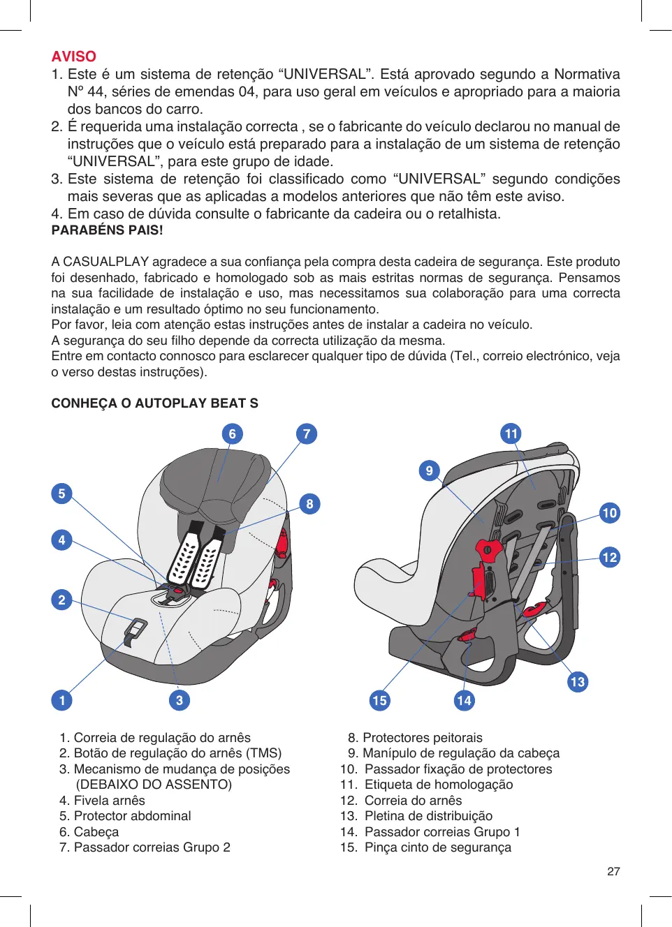 PARABÉNS PAIS! A CASUALPLAY agradece a sua confiança pela compra desta cadeira de segurança. Este produto foi desenhado, fabricado e homologado sob as mais estritas normas de segurança. Pensamos na sua facilidade de instalação e uso, mas necessitamos sua colaboração para uma correcta instalação e um resultado óptimo no seu funcionamento. Por favor, leia com atenção estas instruções antes de instalar a cadeira no veículo. A segurança do seu filho depende da correcta utilização da mesma. Entre em contacto connosco para esclarecer qualquer tipo de dúvida (Tel., correio electrónico, veja o verso destas instruções).