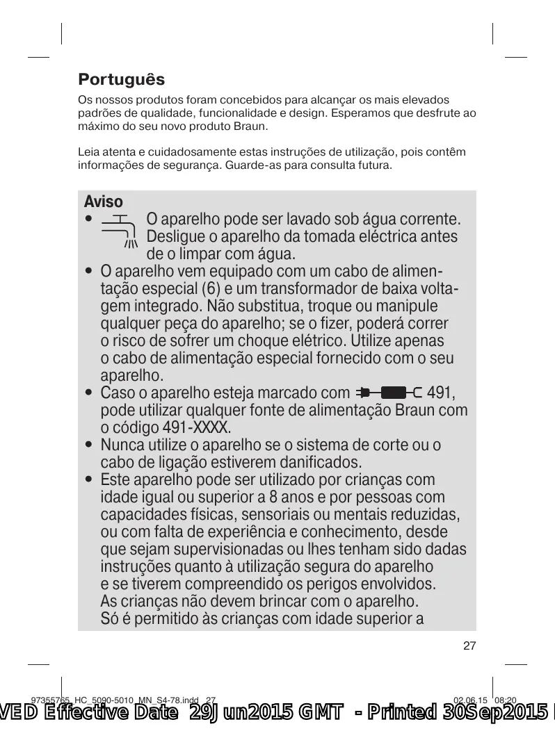 491, puede utilizarlo con cualquier cable de alimentación de Braun con código tipo 491-XXXX. • No utilice el cortapelos si el sistema de corte o el cable especial presentan daños. • Este aparato puede ser utilizado por niños a partir de los 8 años y personas con capacidades físicas, sensoriales o mentales reducidas o con falta de experiencia y conocimiento si se les ha dado la supervisión o instrucciones adecuadas para el uso seguro del aparato y entienden los riesgos que implica. Los niños no deberían jugar con el aparato. Los niños no deberían realizar la limpieza y el mantenimiento del aparato a no ser que sean mayores de 8 años y lo hagan bajo supervisión. Técnica de Braun más cercano: www.service.braun.com. Solo para España Servicio al consumidor: Para localizar a su Servicio Braun más cercano o en el caso de que tenga Vd. alguna duda referente al funcionamiento de este producto, le rogamos contacte con el teléfono de este servicio 901 11 61 84.